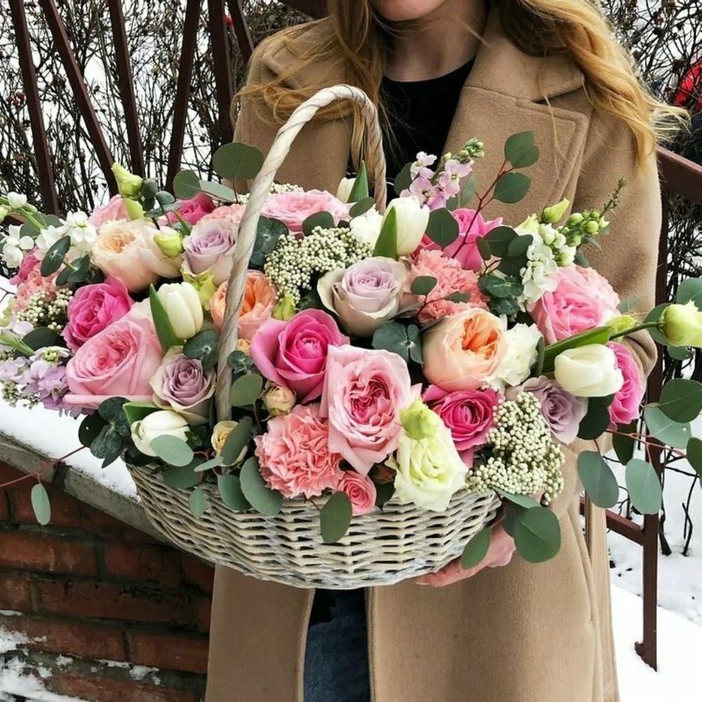 Корзина собрана плотно, каждый цветок находит своё место в общей композиции.