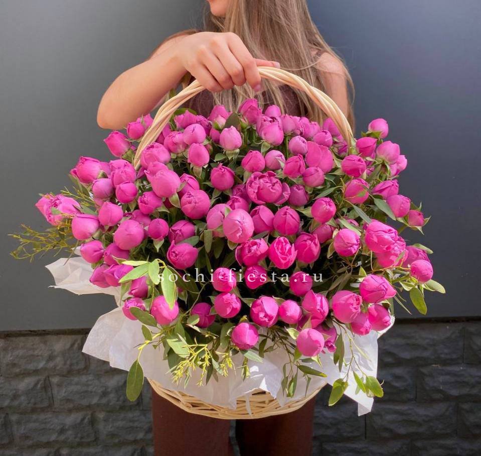 Пятьдесят один бутон Мисти Баблс собраны в плетёную корзину и образуют плотную цветущую полусферу. Лавандовые оттенки раскрываются постепенно и держат форму долго.