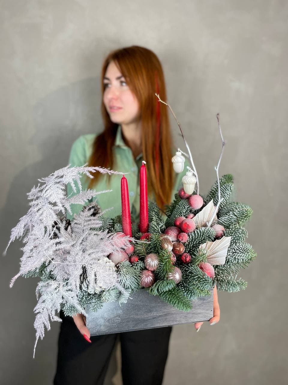 датский нобилис, кашпо, оазис, свечи, новогодние игрушки, декор ВНИМАНИЕ! Готовая композиция (декор) может иметь незначительные внешние отличия от примера на фотографии.