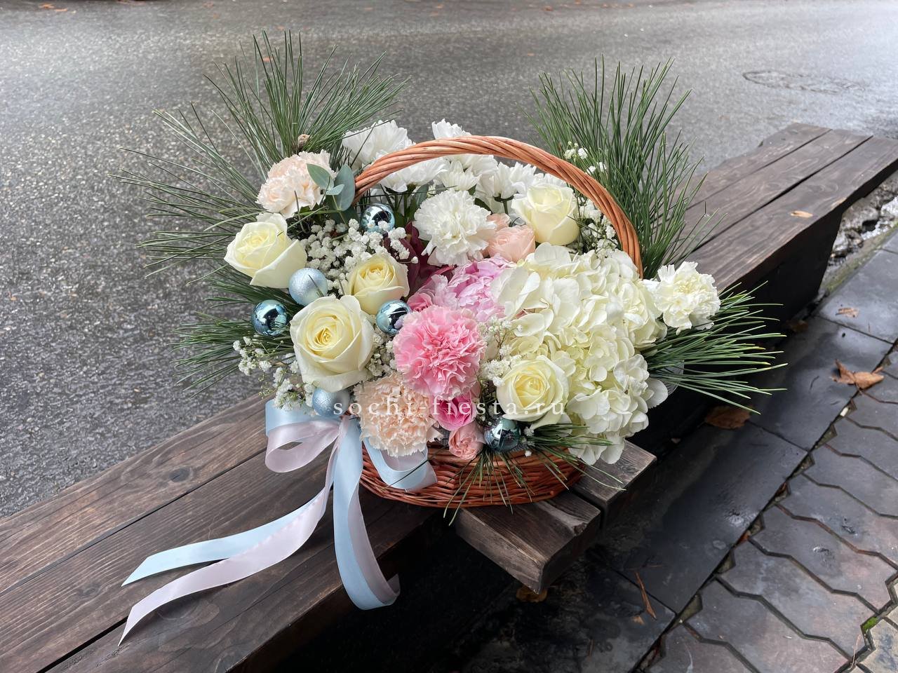 Праздничная корзина сочетает пышную гортензию с бархатистыми розами и яркими хризантемами. Еловые ветви и золотистый бомбастик создают объёмную текстуру, а диантусы и гипсофила добавляют воздушности композиции.
