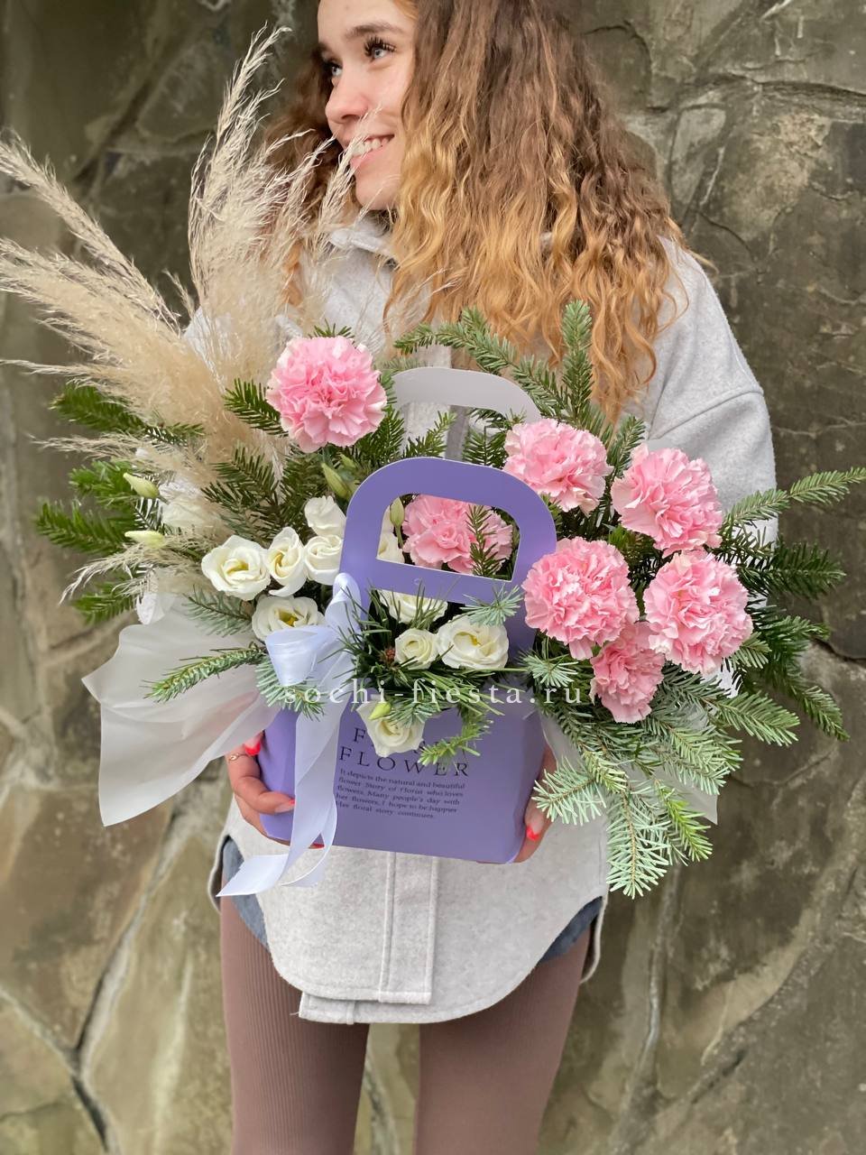 Диантусы и эустомы соседствуют с веточками нобилиса в компактной сумочке. Пампасная трава вносит мягкую текстуру, а лента фиксирует форму и добавляет завершённость композиции.