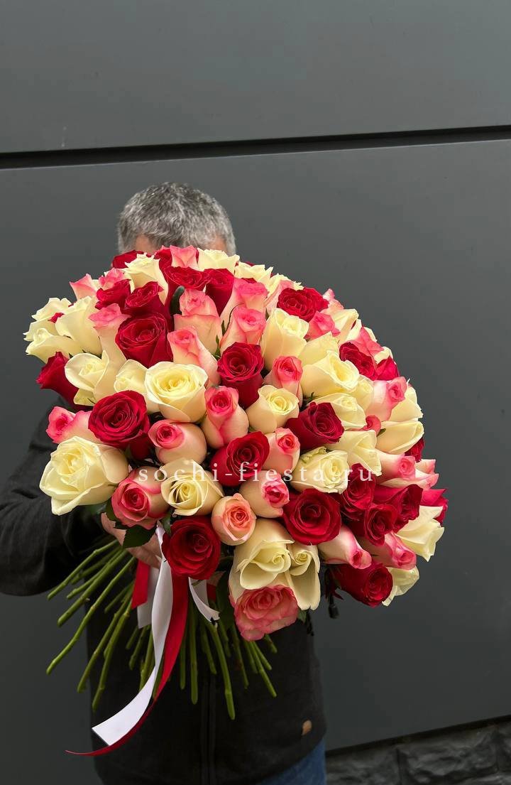 Сто одна роза Джули в ярком миксе оттенков создаёт живописную палитру. Каждый бутон добавляет свой цвет в общую картину, где краски перетекают одна в другую, рождая праздничное настроение.