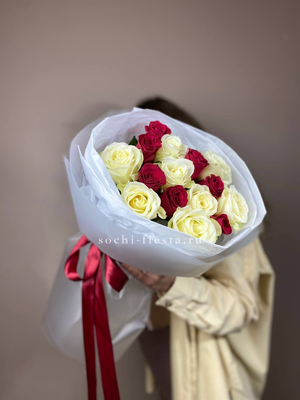 Сорок пять бутонов формируют пышную композицию с заметным присутствием в любом пространстве. Красные и белые розы раскрываются постепенно, сохраняя свежесть несколько дней.