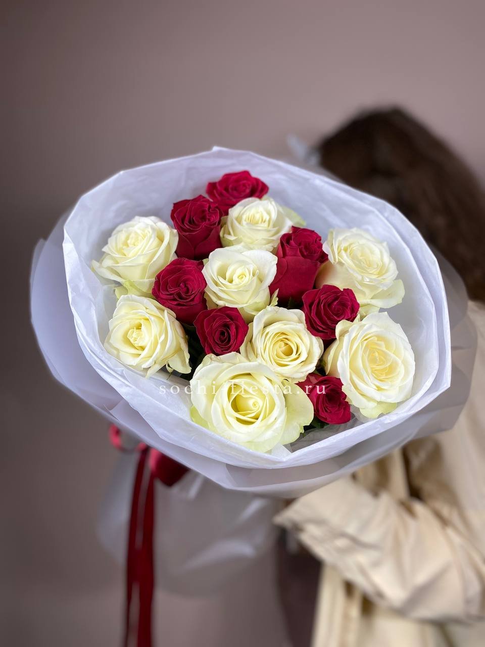 В составе 45 красно-белых роз.