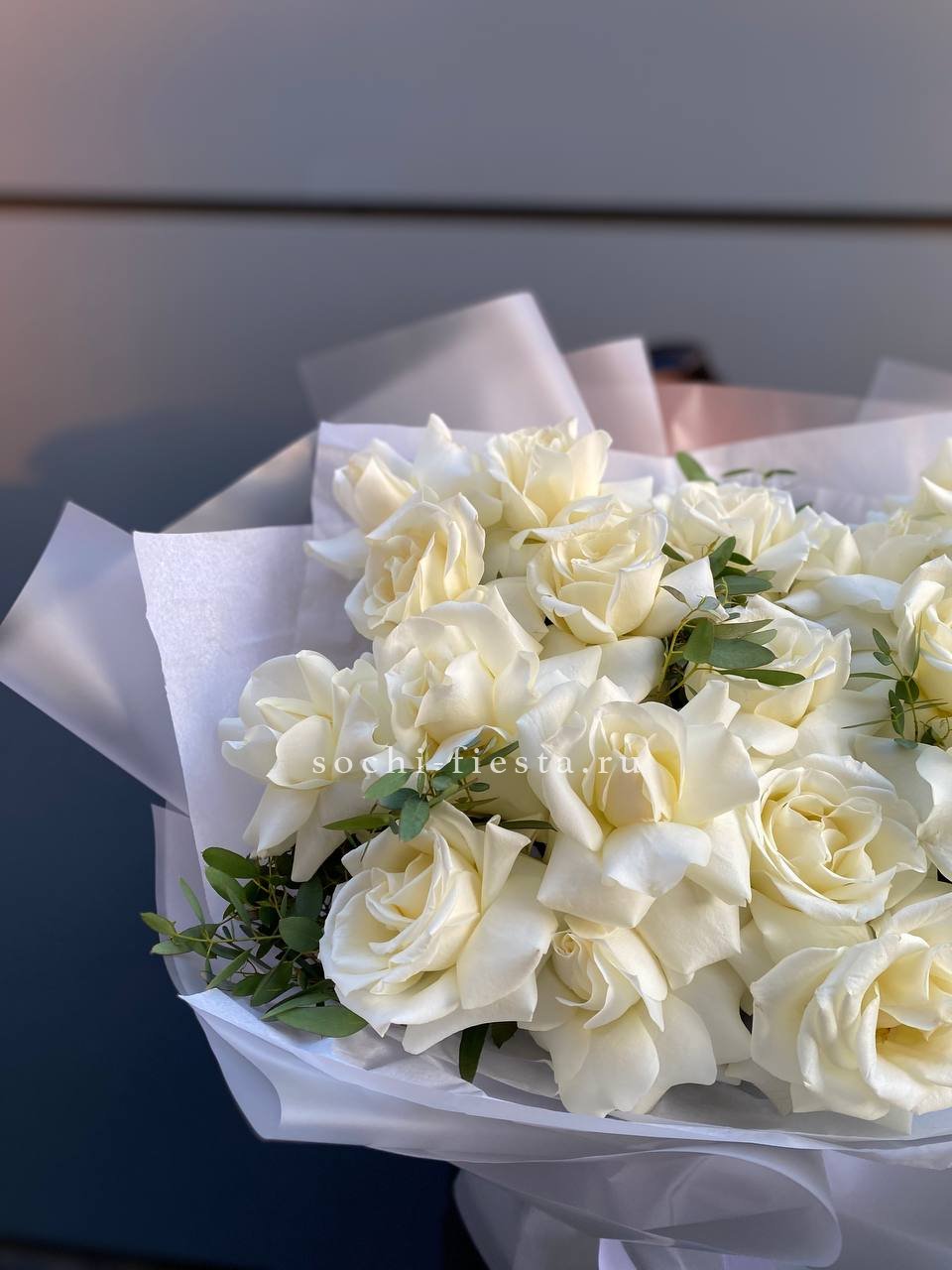 Пятнадцать белых роз в упаковке кофейного оттенка создают спокойное сочетание света и теплой глубины. Лаконичная форма букета удобна для вручения и дальнейшего размещения.