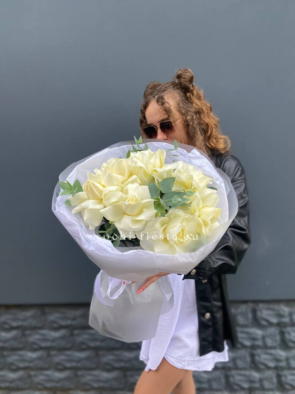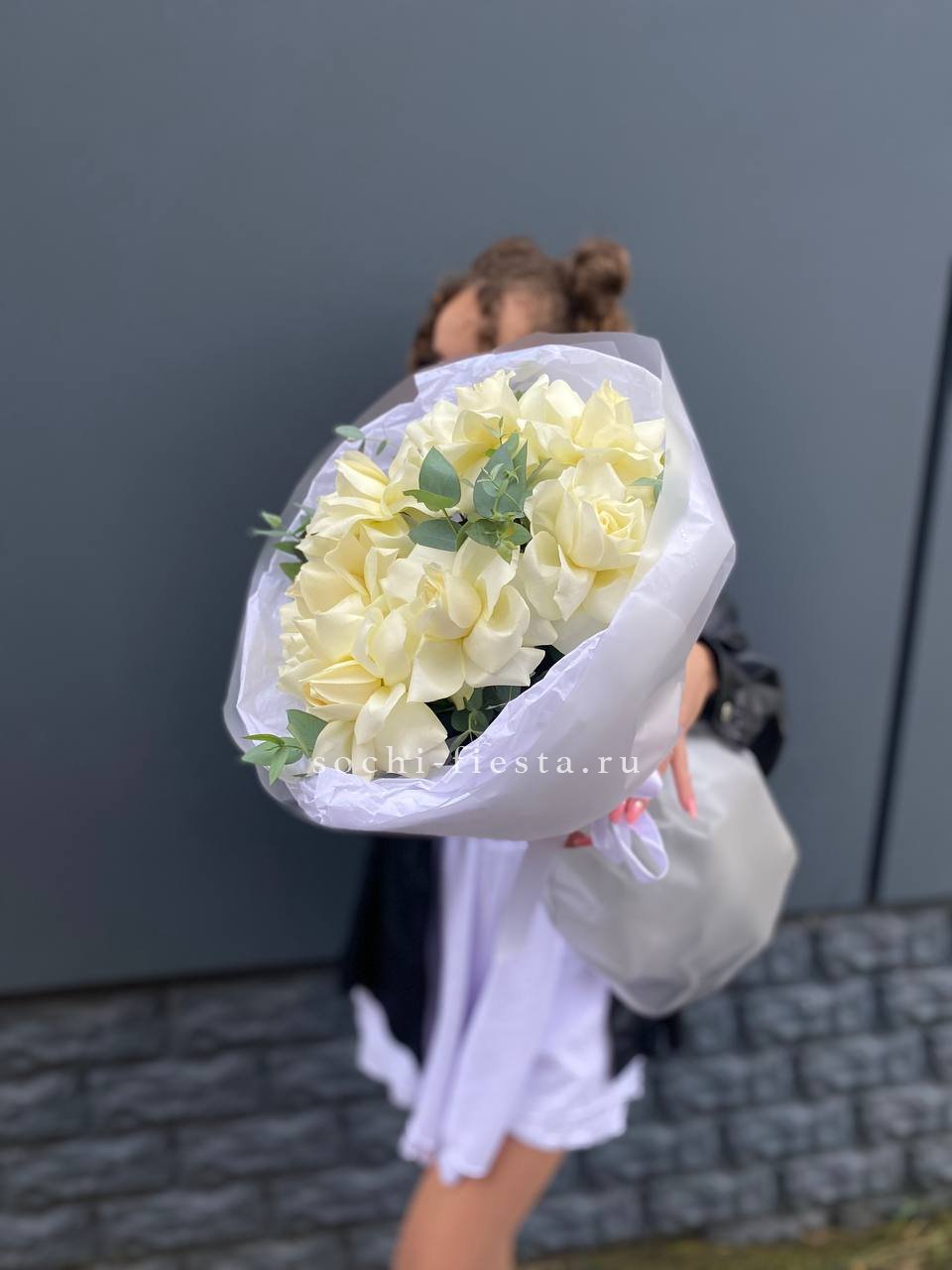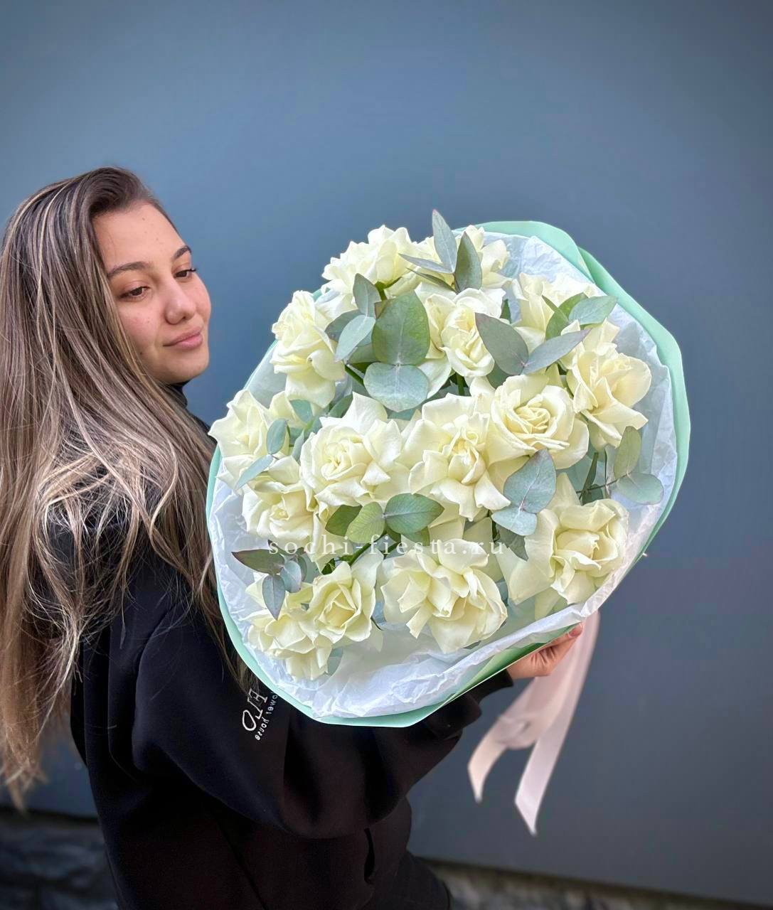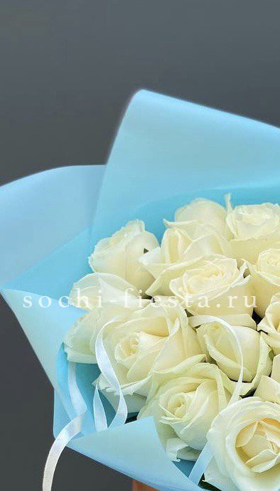 Белоснежные лепестки создают ощущение света и простора. Двадцать один бутон образует воздушную композицию с мягким переходом оттенков. Букет дарит момент тишины и покоя.