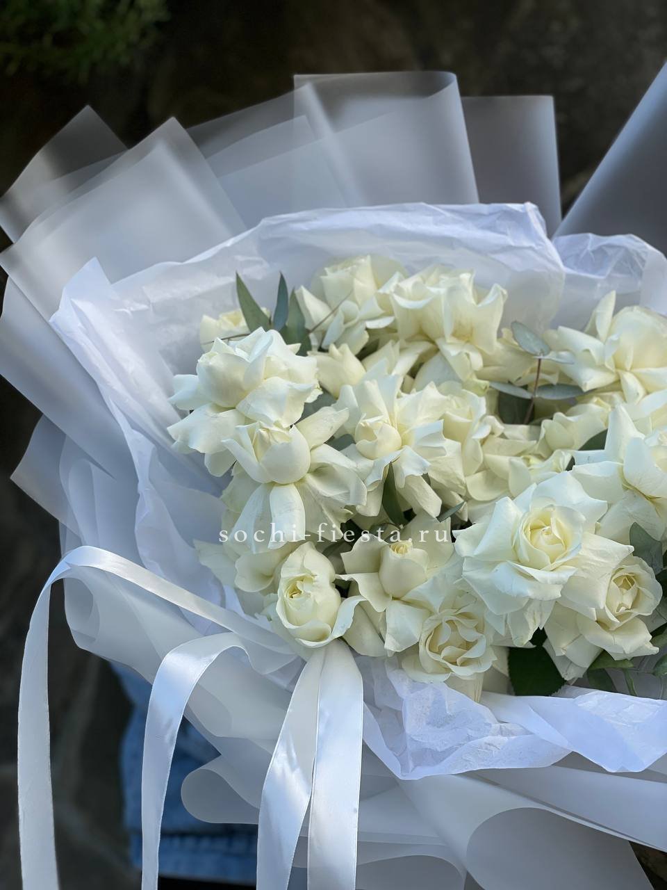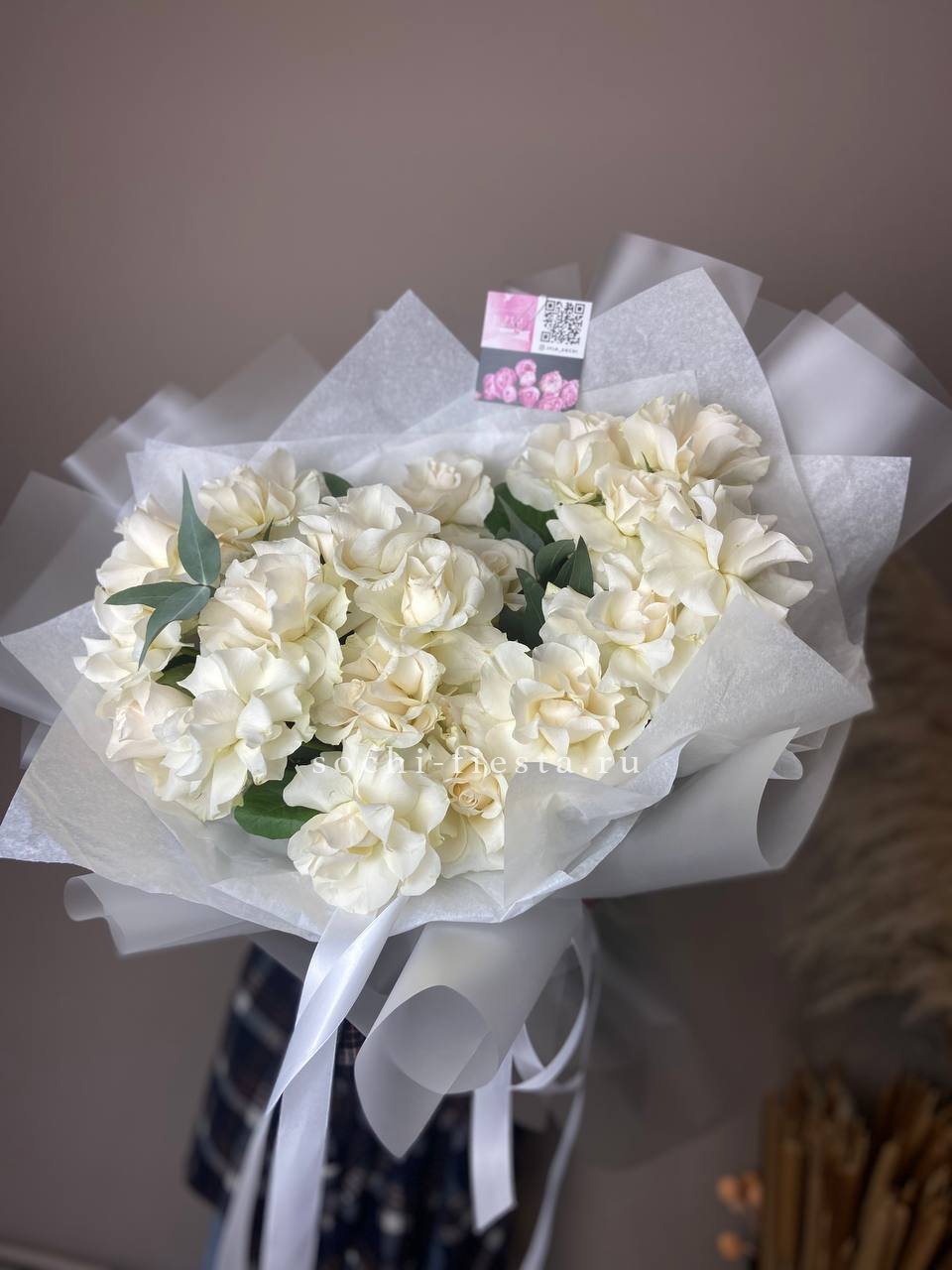 Семь белых бутонов в лаконичной обёртке. Компактная форма и чистота линий делают букет удобным для любого интерьера.
