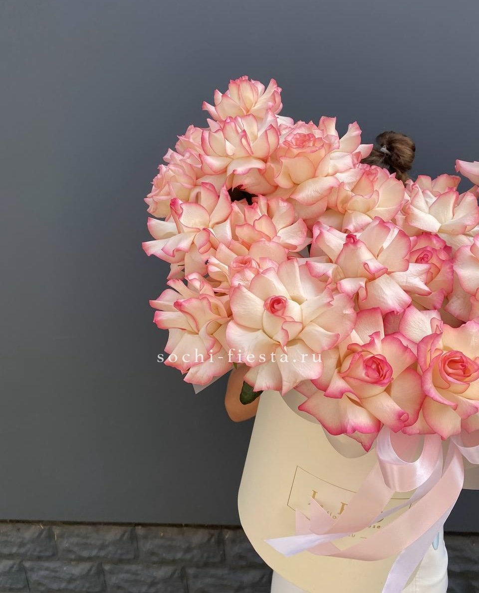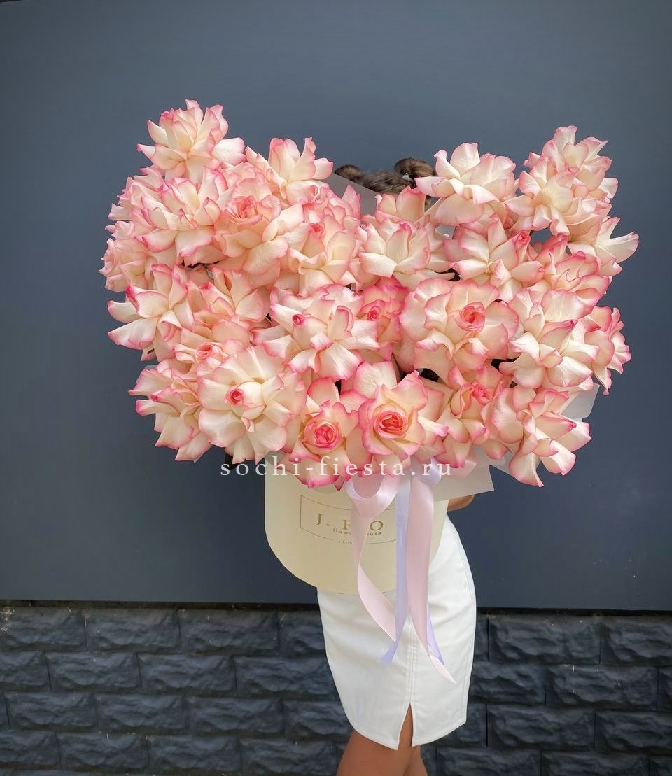 Двадцать пять роз в плетеной корзине держат форму без дополнительной поддержки. Композиция компактна и устойчива, не требует поиска подходящей вазы. Удобный формат для долгого восхищения цветением.