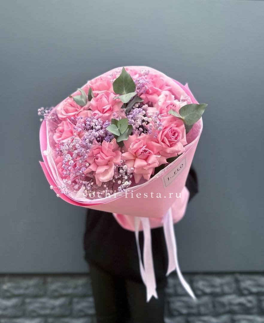 Одиннадцать вывернутых роз с волнистыми лепестками создают объёмную текстуру букета. Гипсофила добавляет воздушности, а эвкалипт завершает композицию свежими нотами.