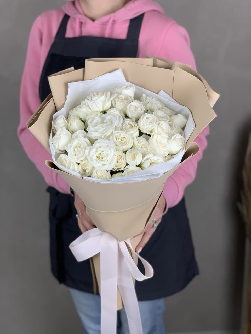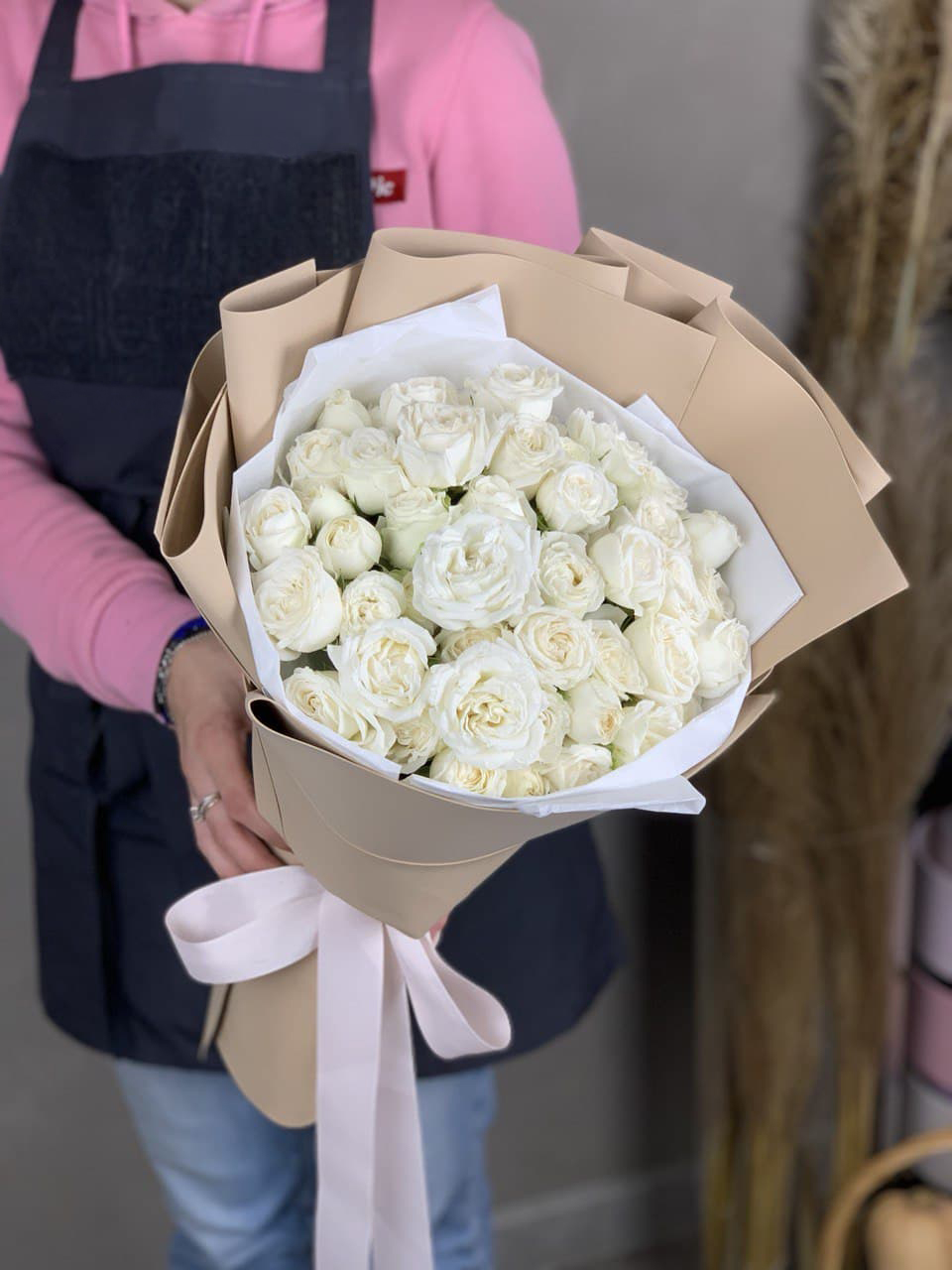 Белые кустовые розы собраны плотно и графично. Серебристый эвкалипт добавляет воздуха и свежести между соцветиями. Букет выглядит лаконично и легко вписывается в современное пространство.