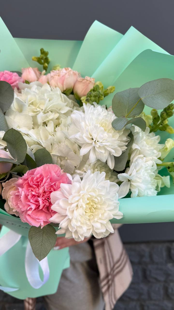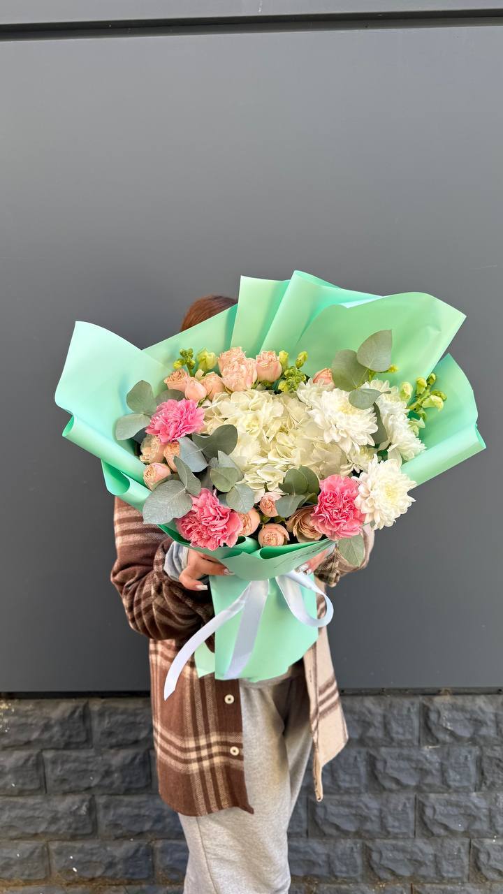 Воздушная композиция с пышной гортензией и розами Джумилия создает объемный силуэт. Маттиола и альстромерия добавляют легкости, а бомбастик вносит яркие акценты в общую структуру букета.