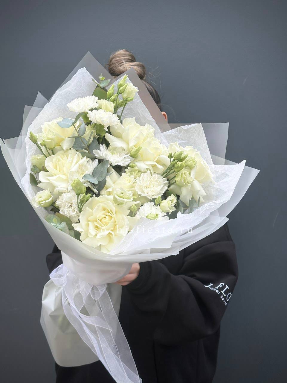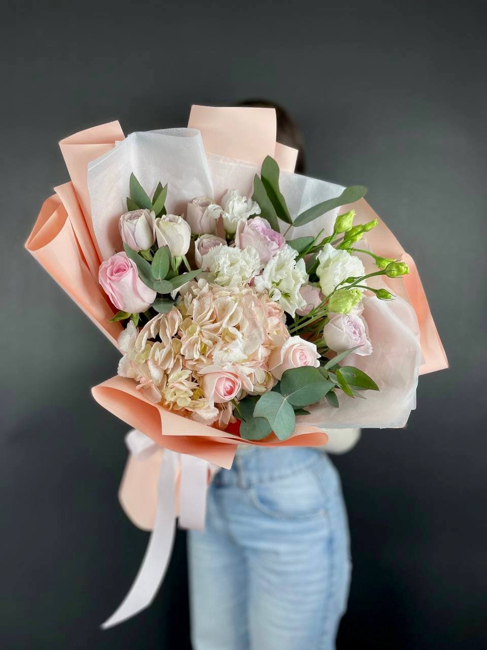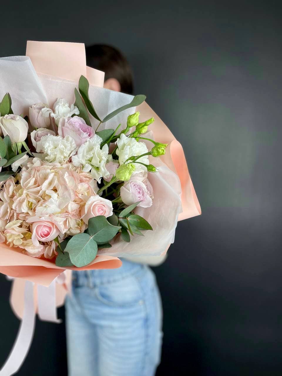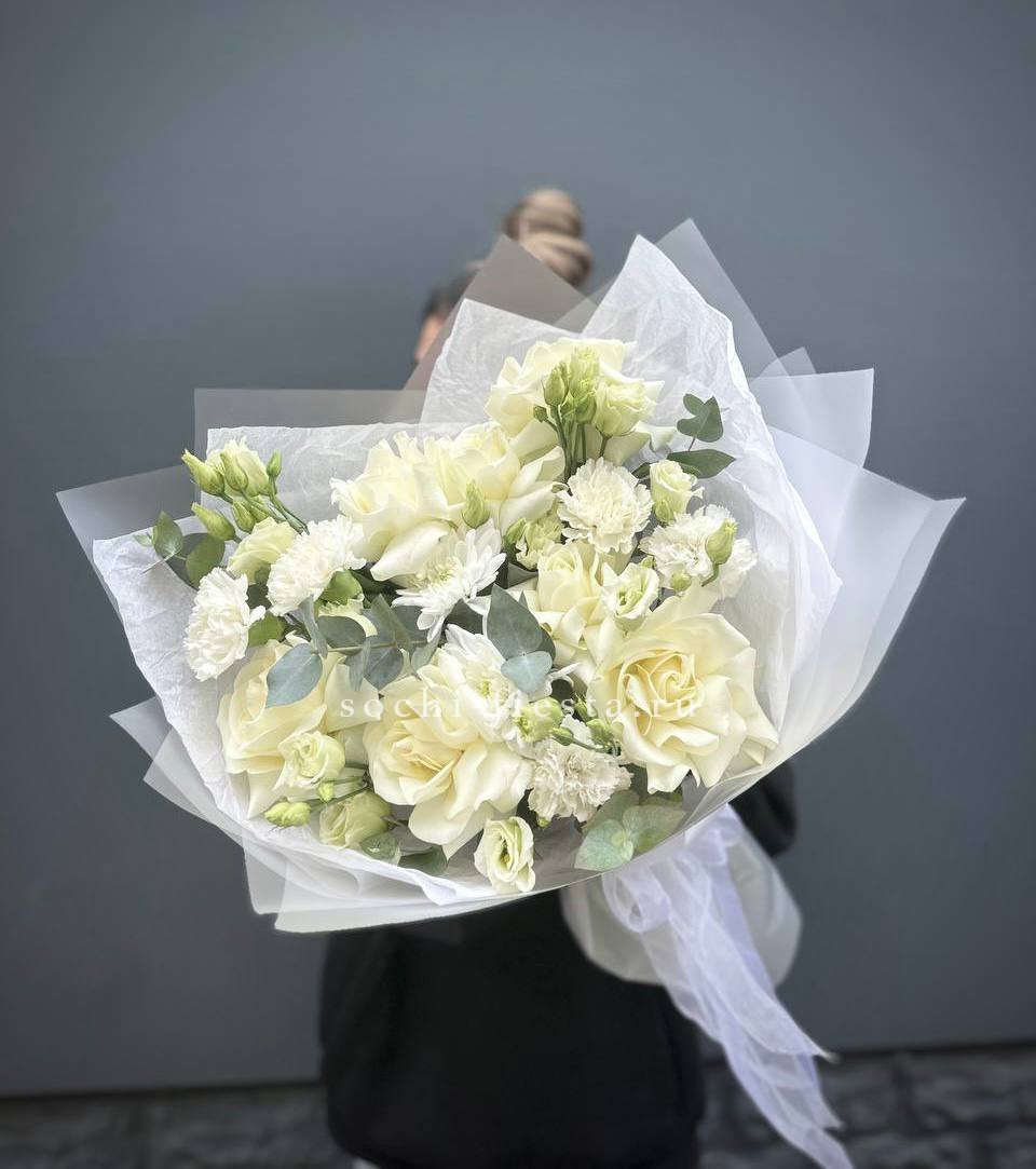 Белые розы и шары гортензии заполняют пространство плотно, но без тяжести. Озатамус вносит лёгкую текстуру, а эвкалипт завершает силуэт спокойной зеленью.
