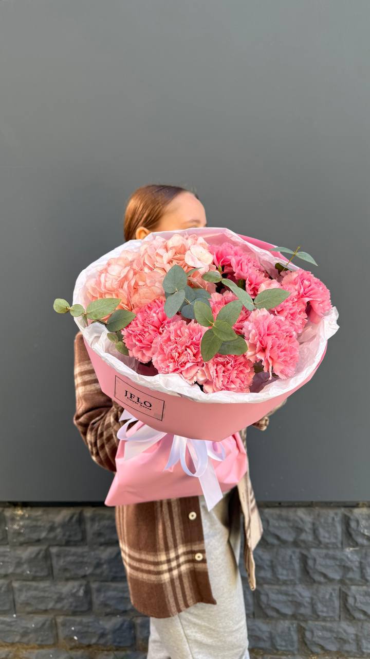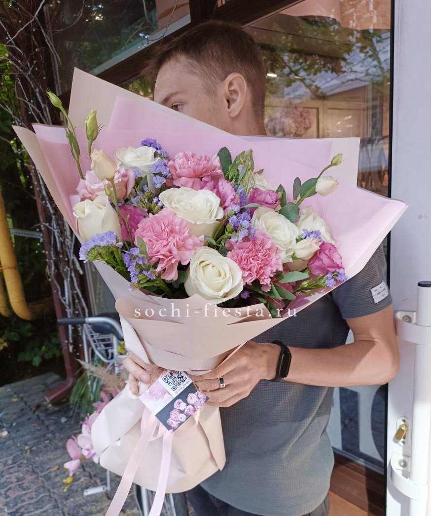 Белые розы и эустома образуют воздушный объем, где каждый бутон дышит свободно. Диантус добавляет графичности, а эвкалипт создает прохладную дымку по краям. Букет для тех, кто ценит легкость и современную флористику.