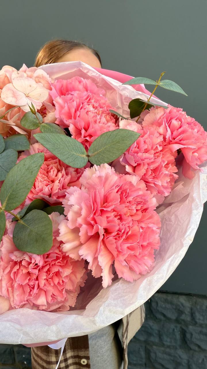 диантус, бомбастик, белые розы, эвкалипт, эустома, упаковка.