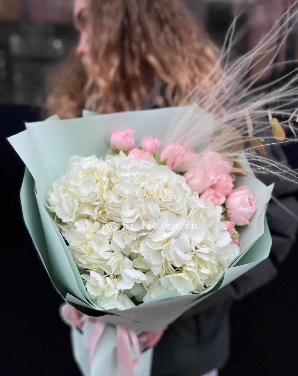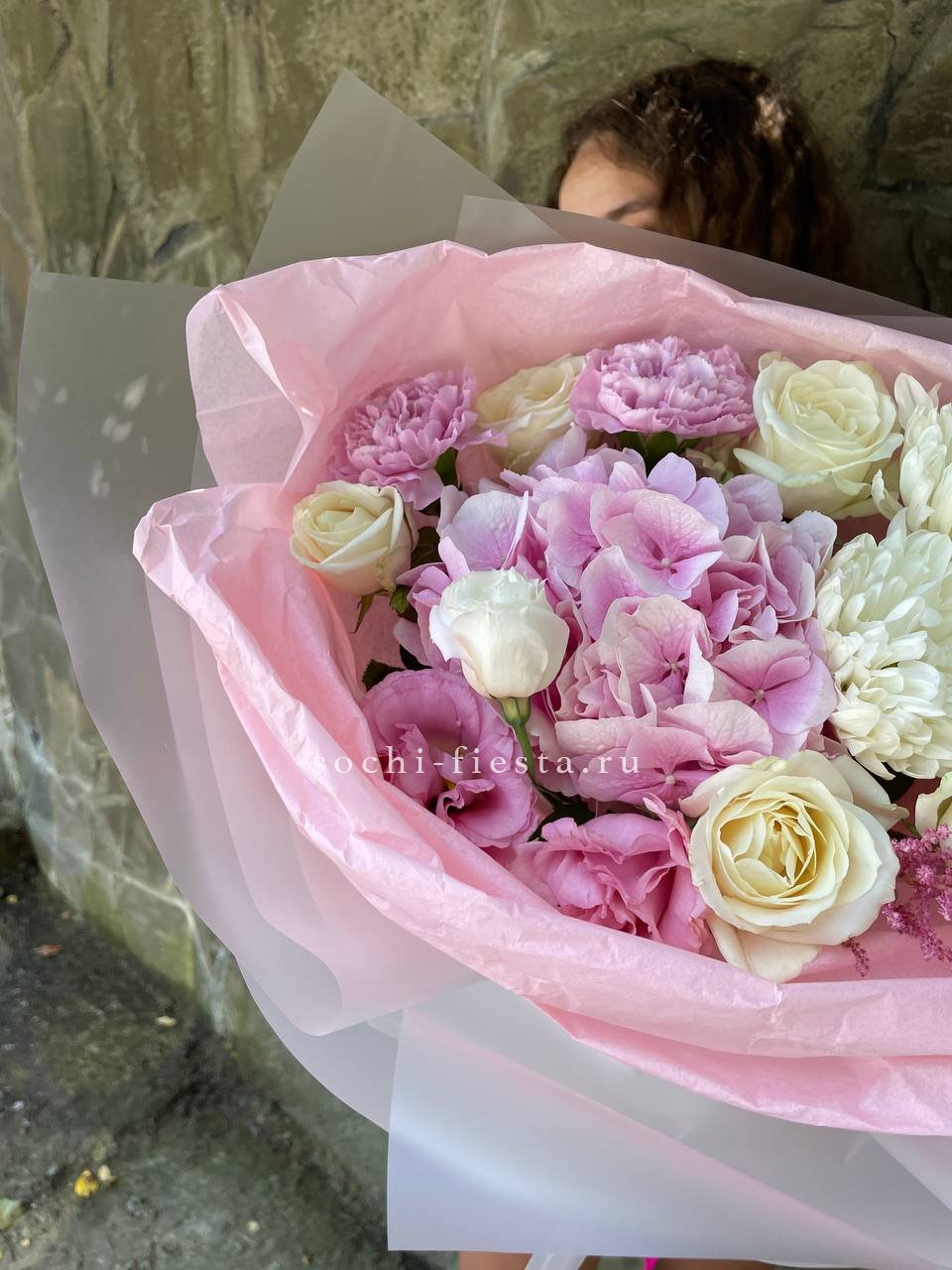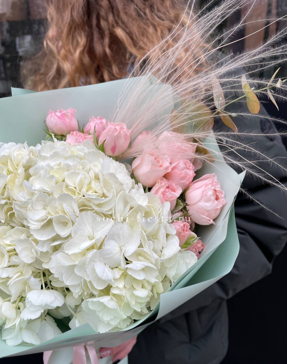 гортензия, роза, эустома, бомбастик,  эвкалипт, лента, дизайнерская пленка.