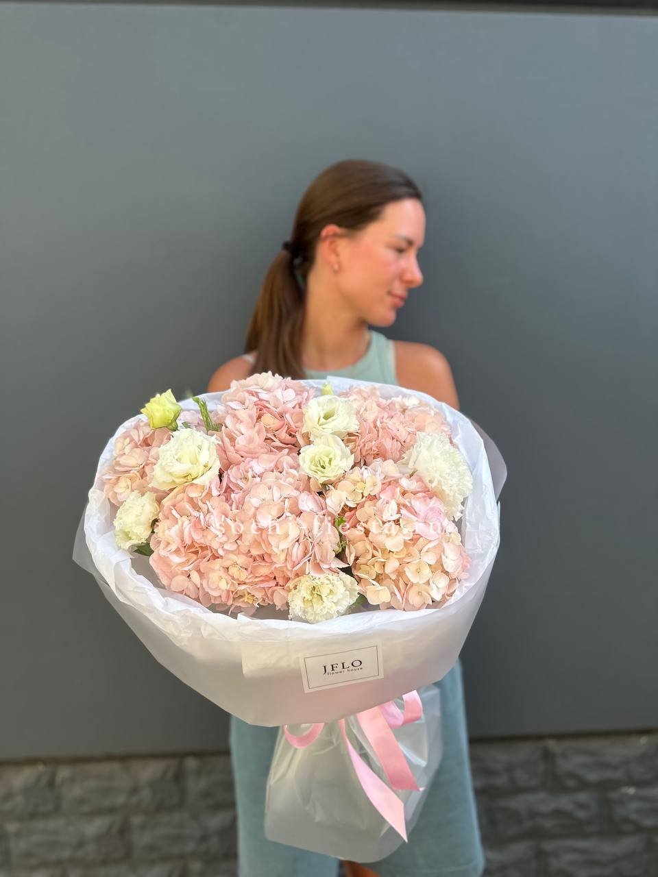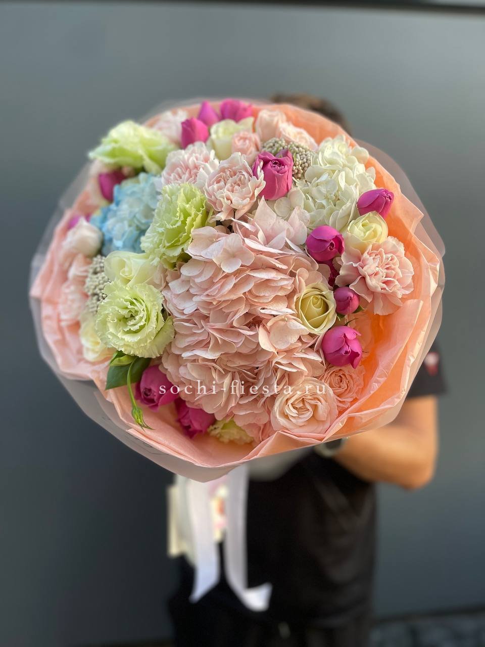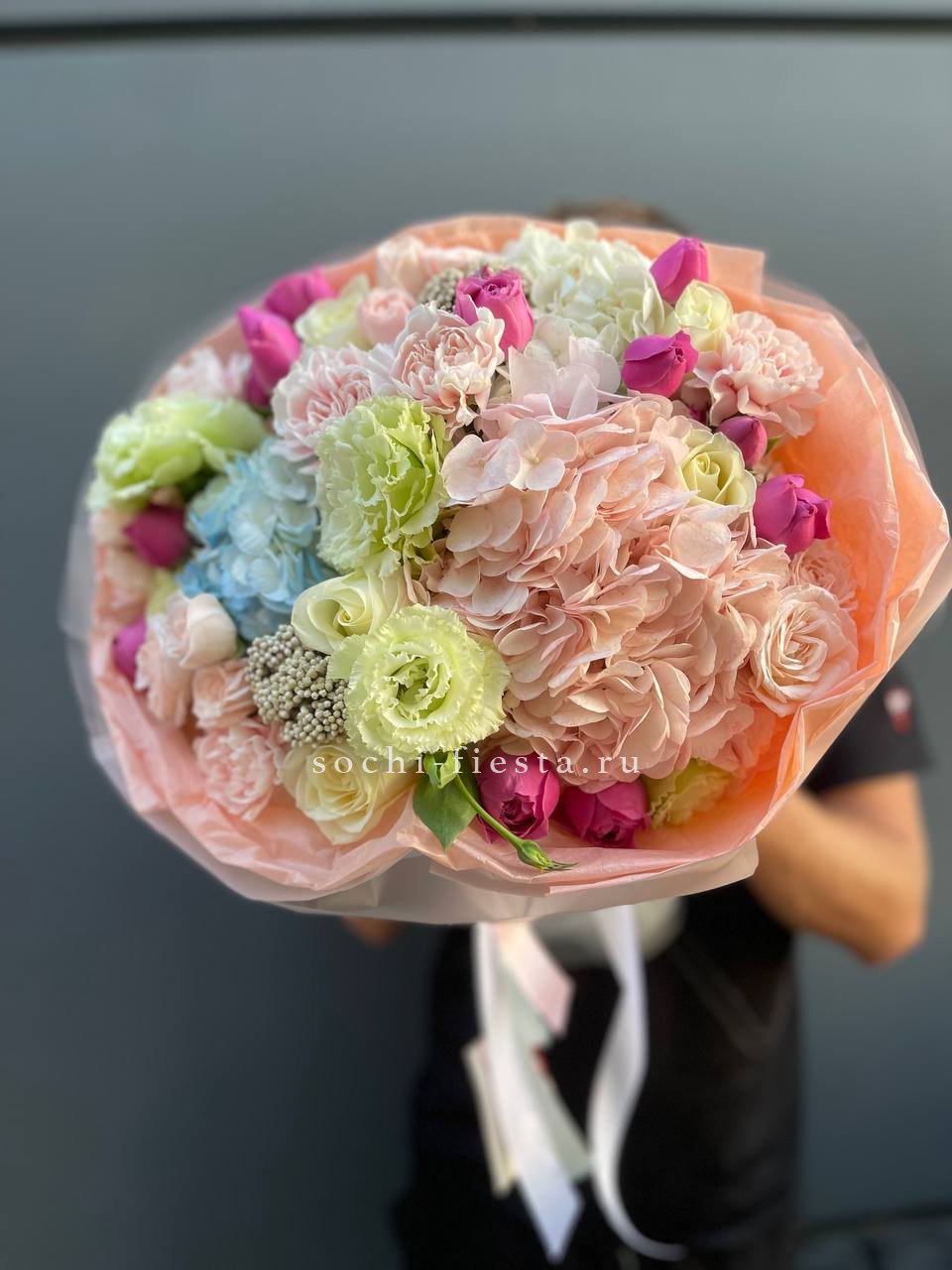 французские розы, маттиола, гортензии, эвкалипт, стифа, упаковка, лента.