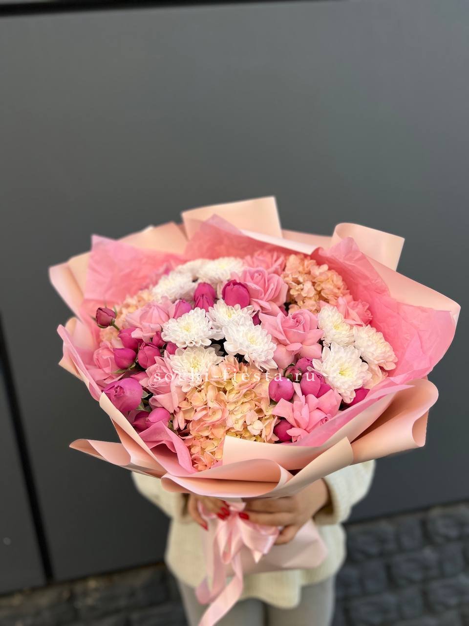 Плотные бутоны пионовидных роз соседствуют с классическими французскими сортами, создавая игру форм и текстур. Розовая палитра раскрывается через разную степень раскрытия лепестков, от плотных до воздушных.