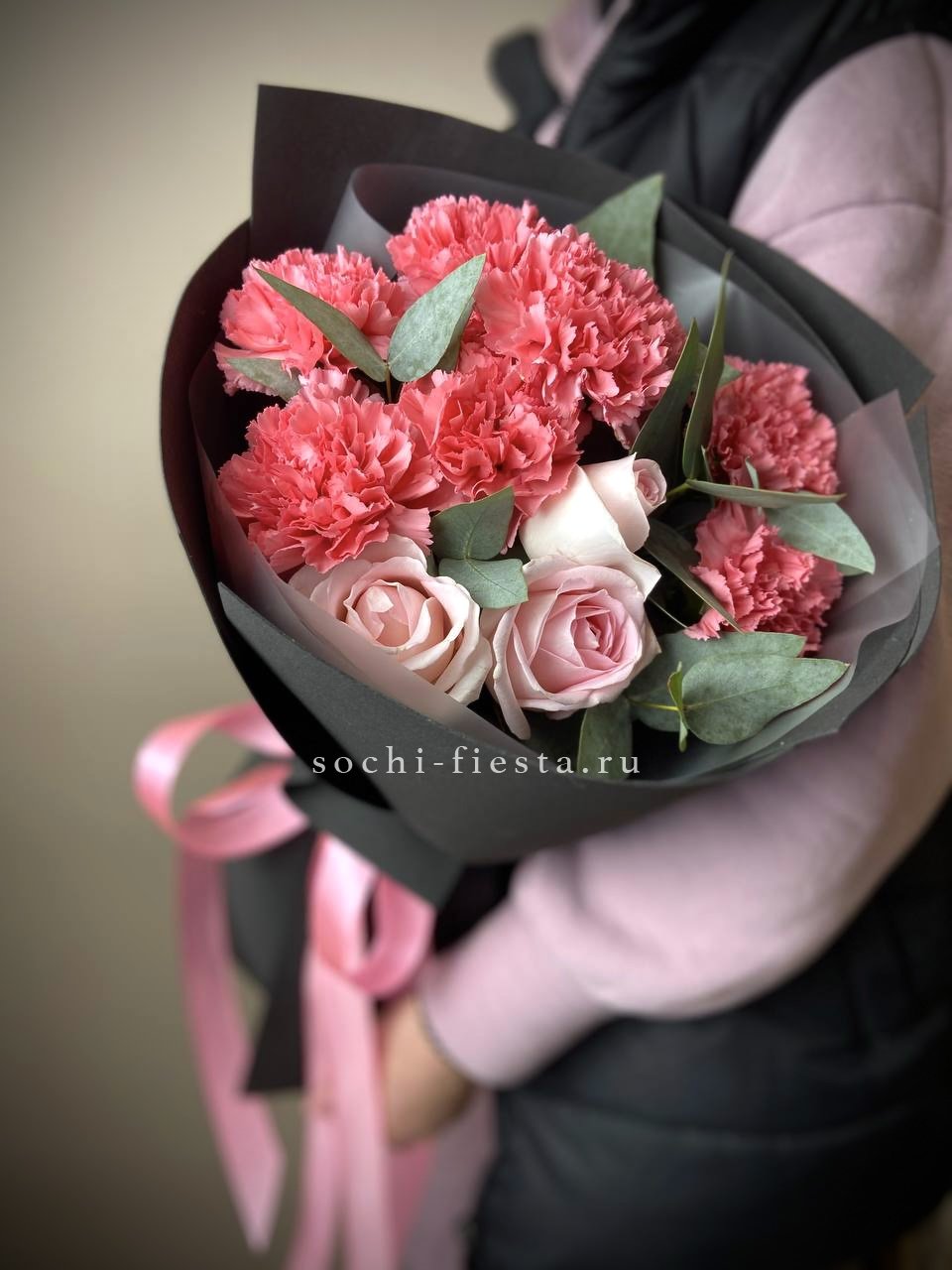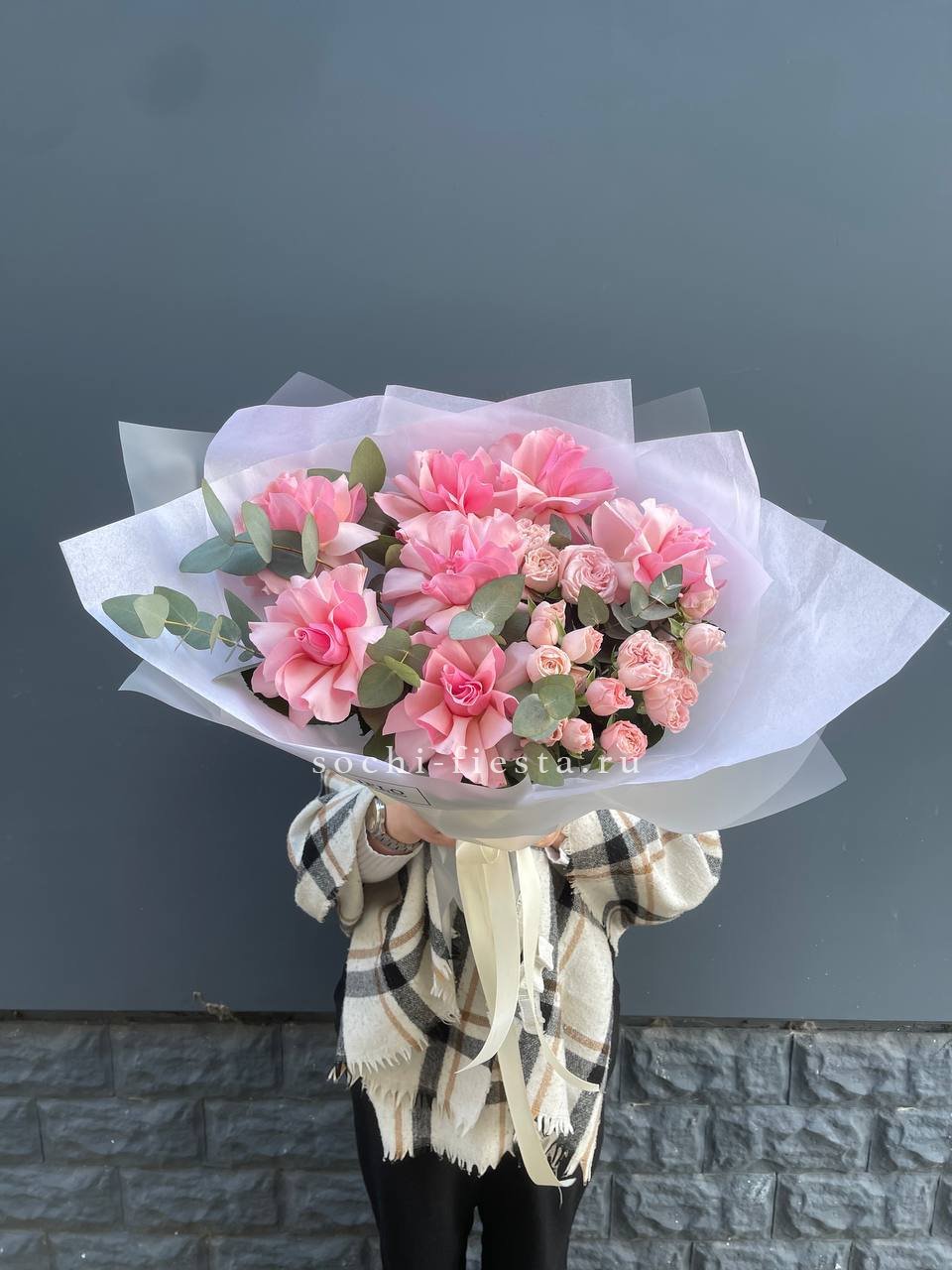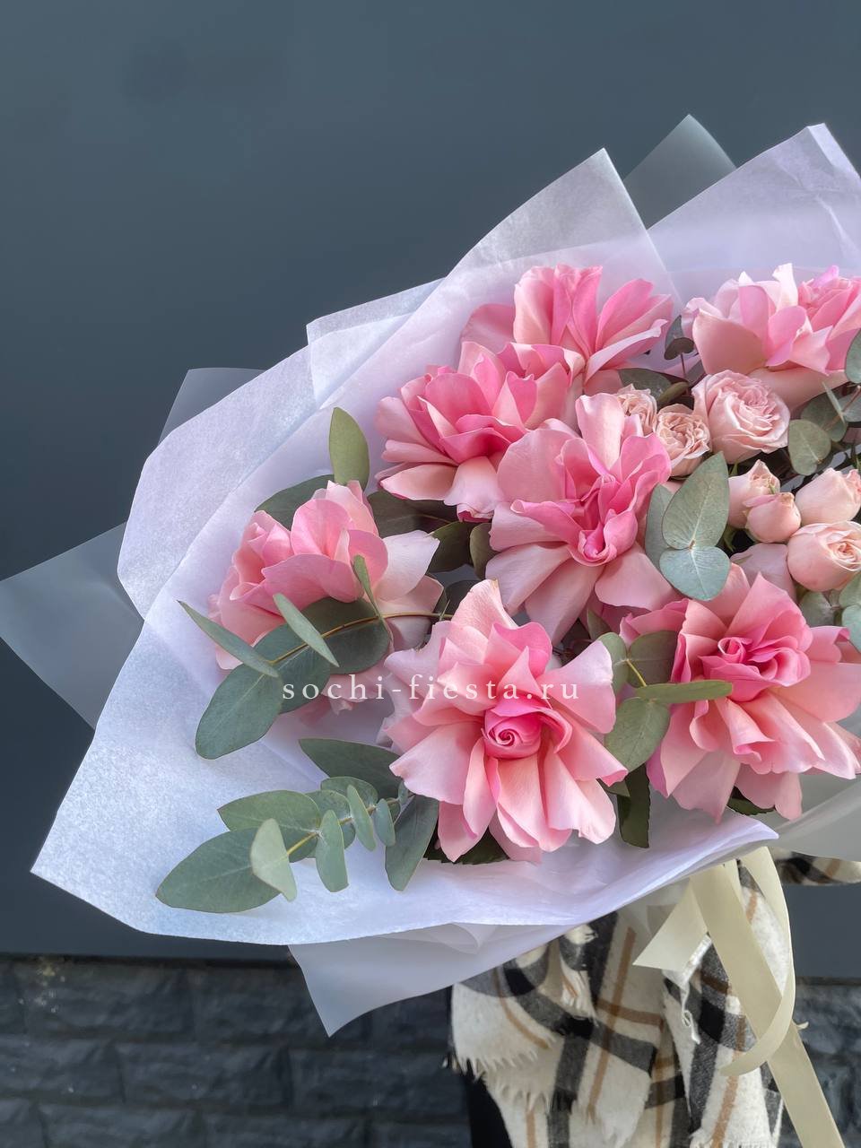 Розовые розы, пионовидная кустовая роза, эвкалипт,  лента, авторская упаковка.