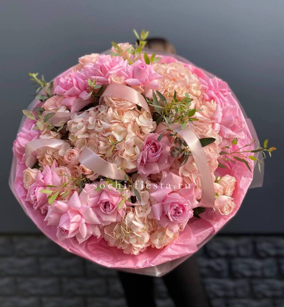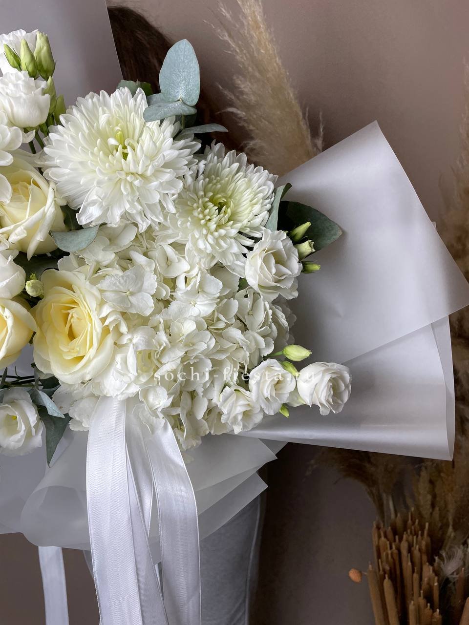 гортензия, хризантема, хамелациум, гербера, мисти баблс, диантус, пленка.