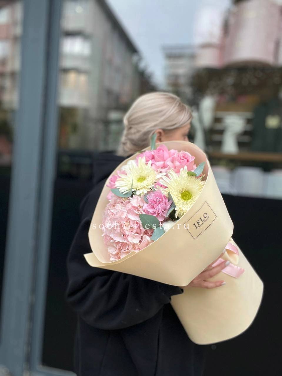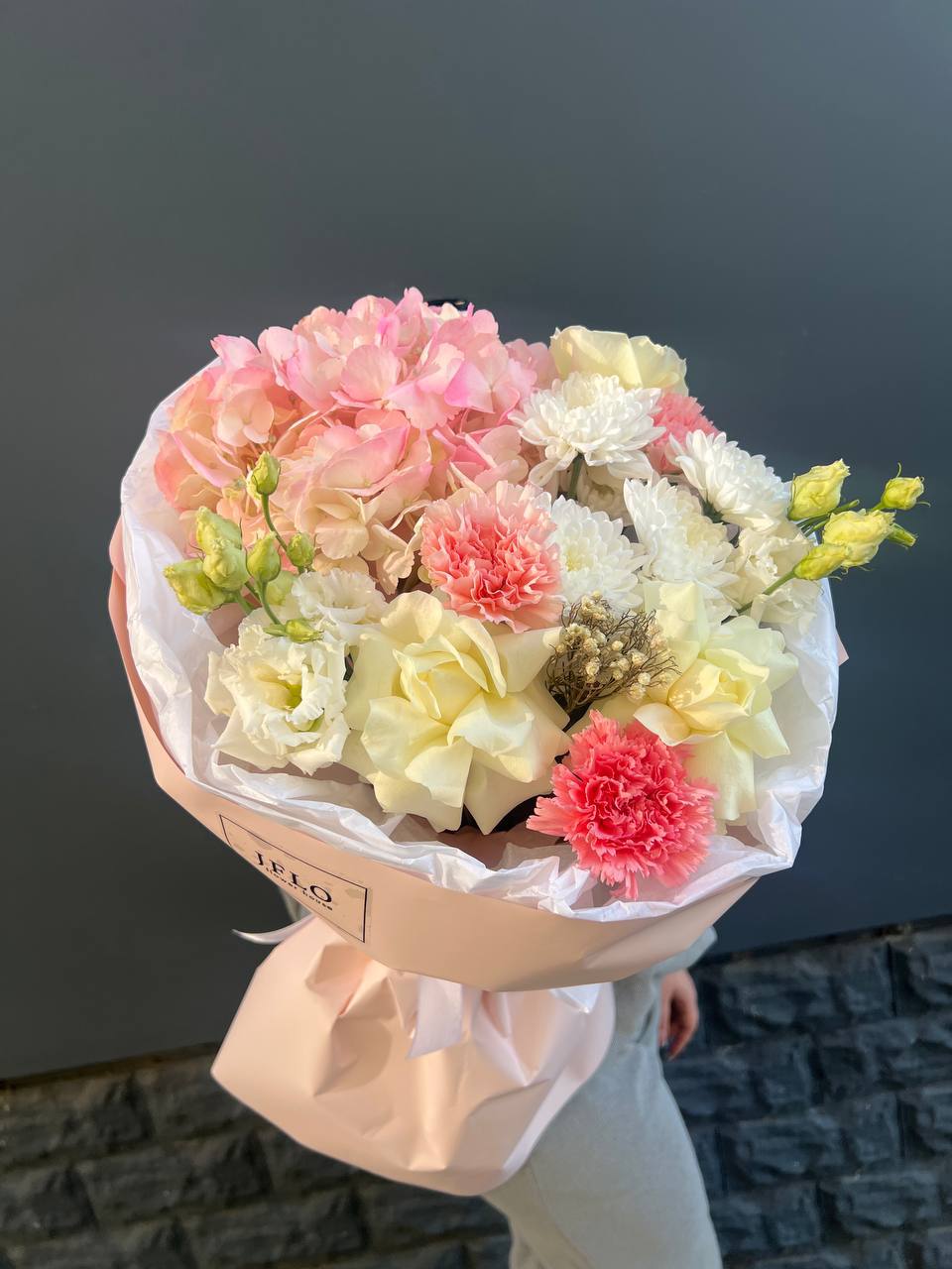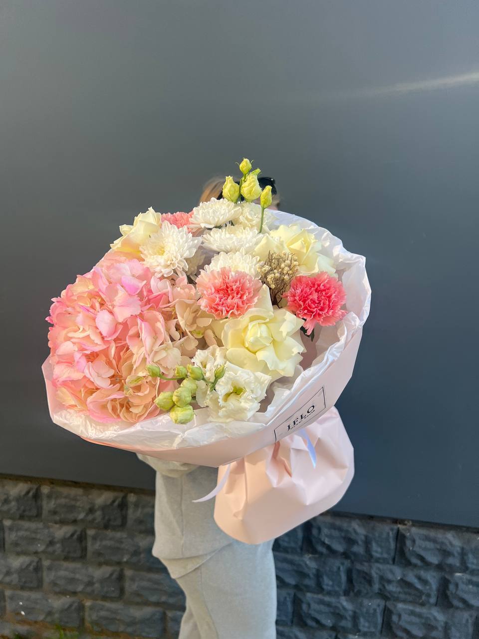 Пастельные оттенки гортензий переплетаются с белоснежными хризантемами, создавая воздушную дымку. Мягкие переходы тонов напоминают утренний туман над садом.