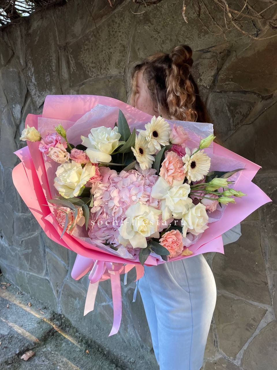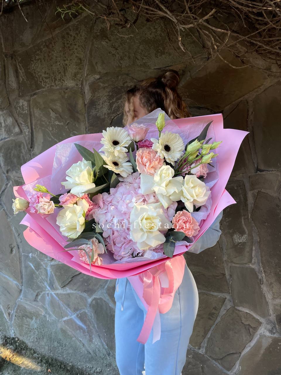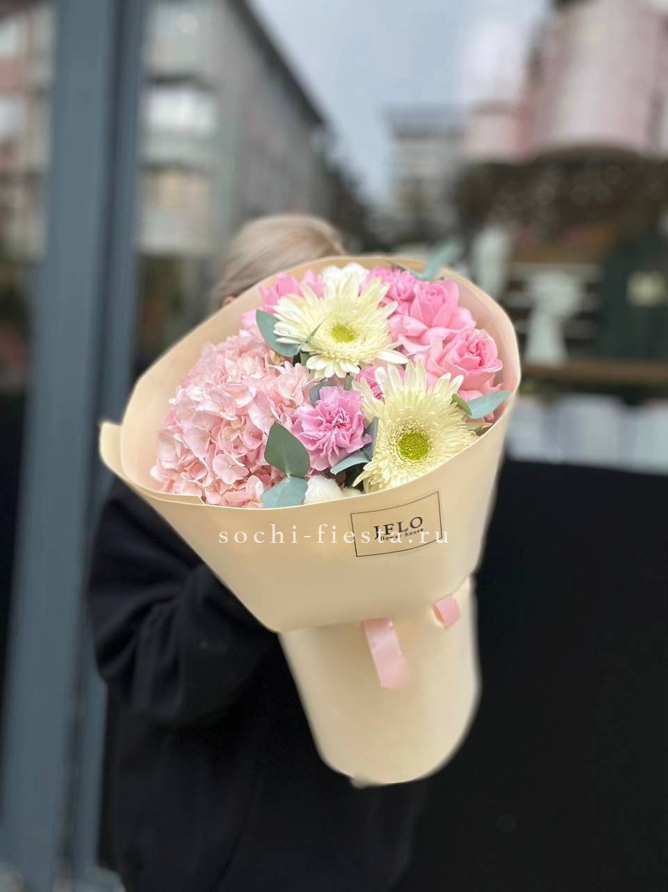 Пастельные оттенки гортензий переплетаются с белоснежными хризантемами, создавая воздушную дымку. Мягкие переходы тонов напоминают утренний туман над садом.