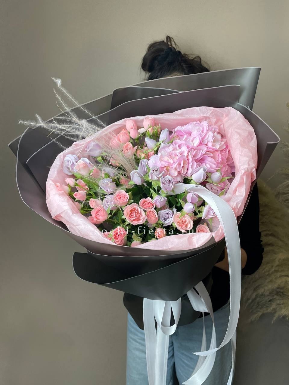 гортензия, мисти баблс, джумилия, эвкалипт, хлопок, упаковка.