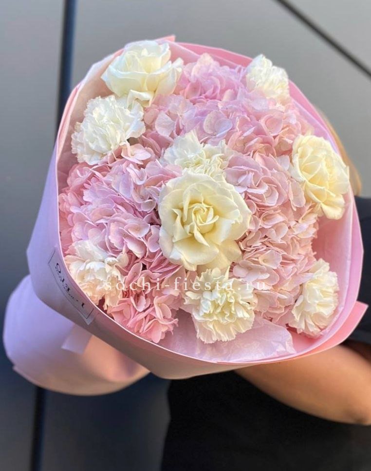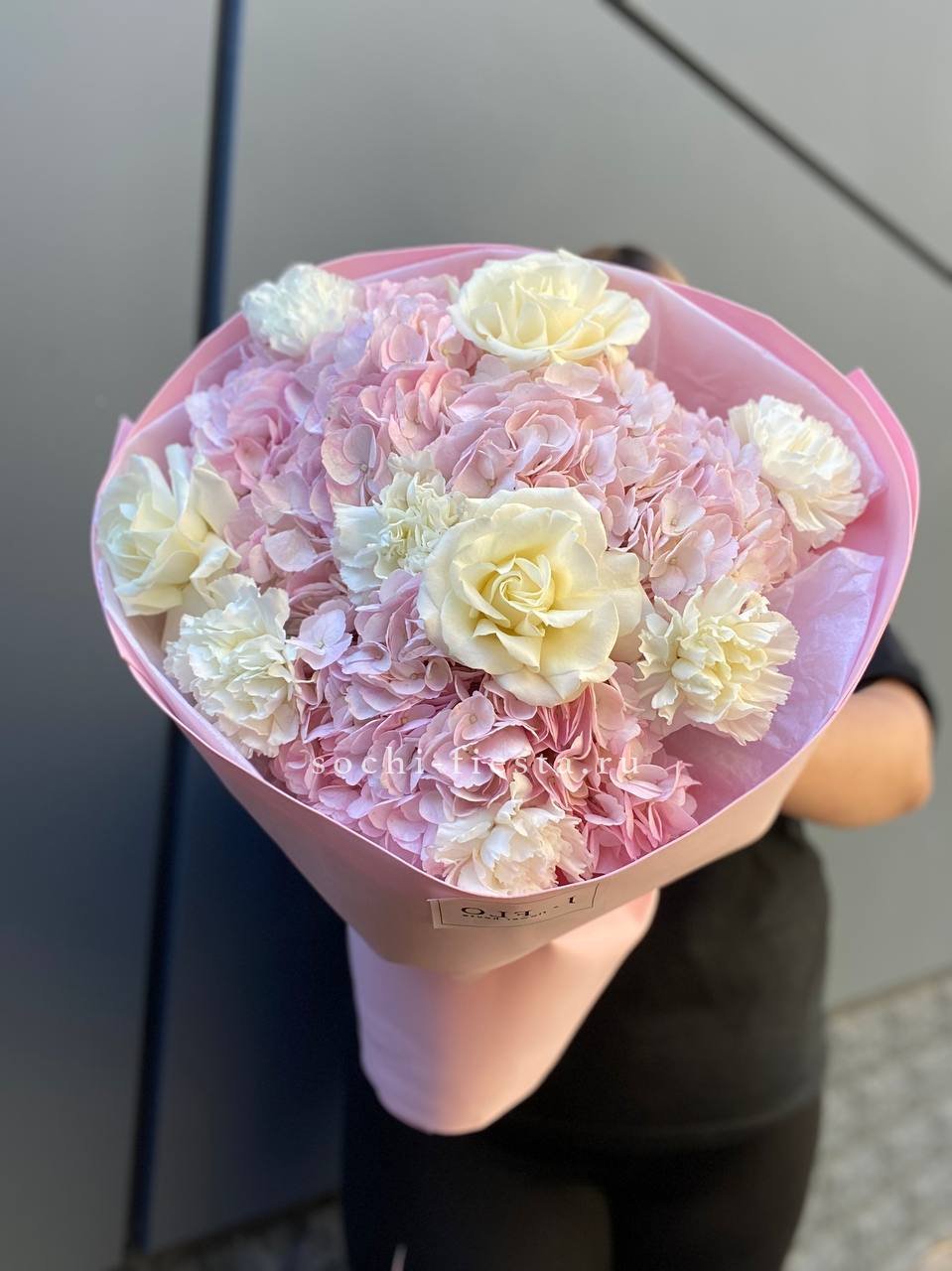 гербера, роза, хлопок, гортензия, диантус, эвкалипт, упаковка.