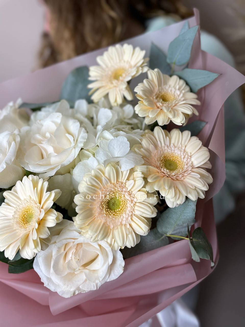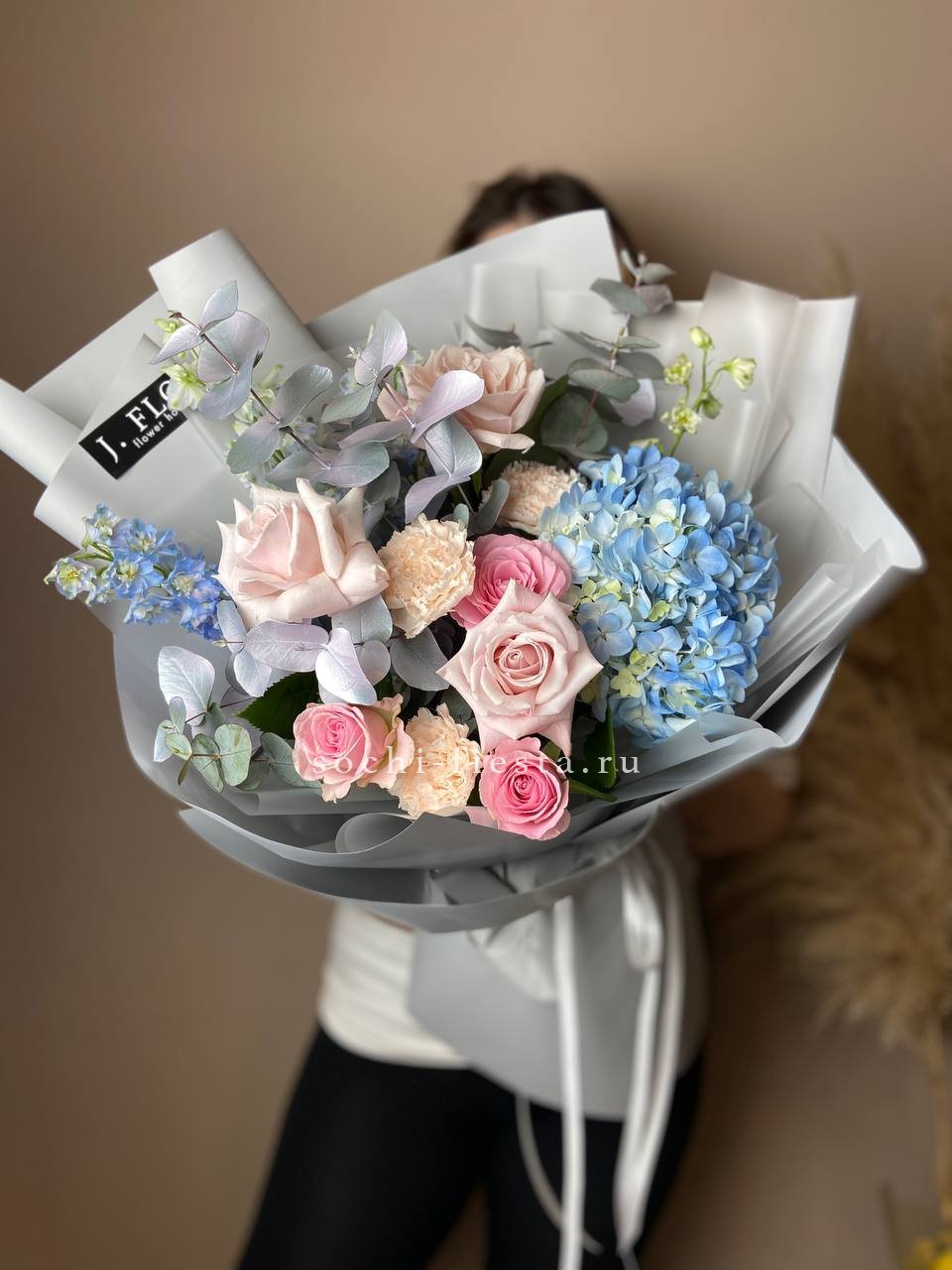 диантус, эустома, гортензия, хайди, эвкалипт, озатамус, пленка.