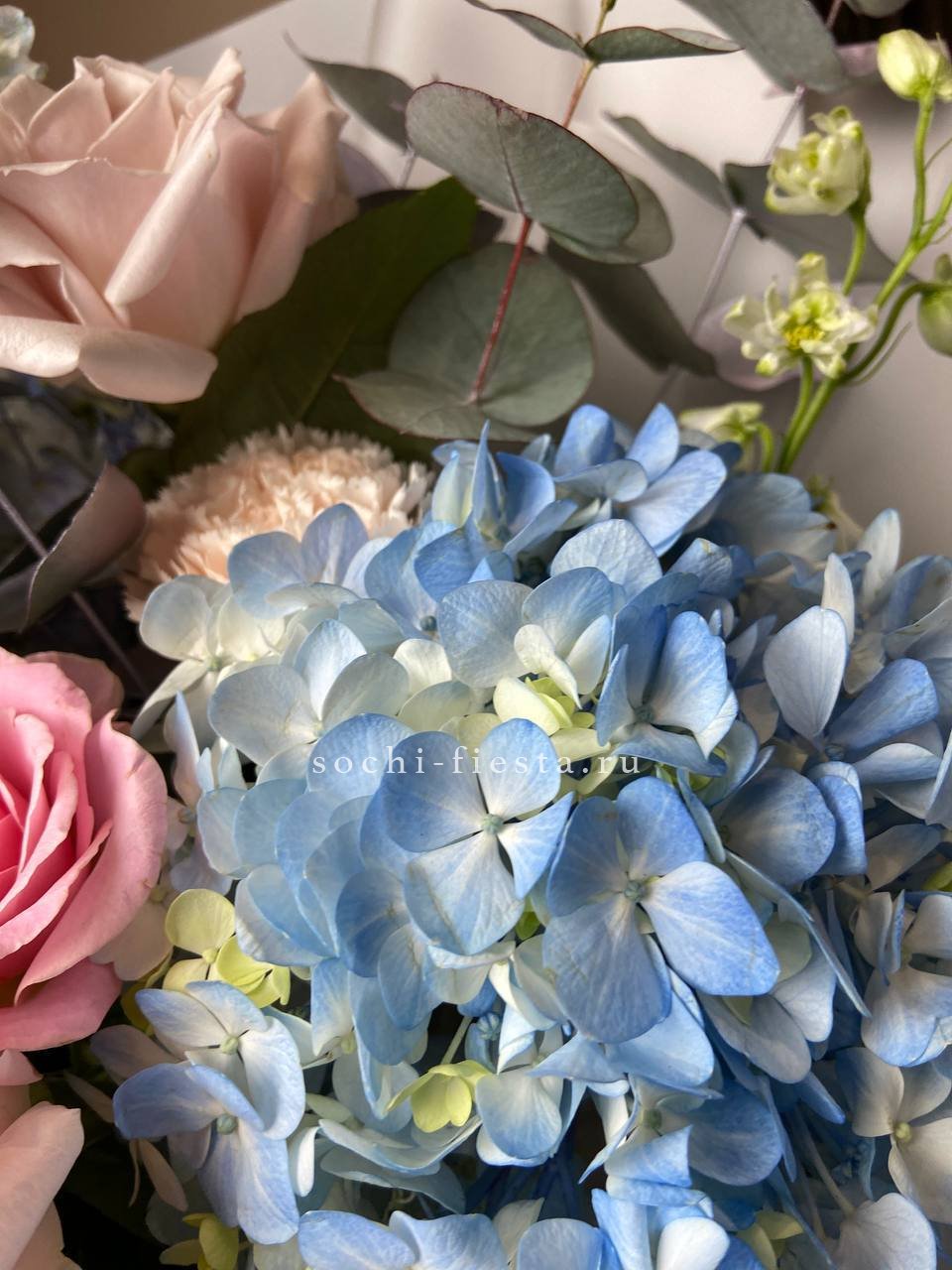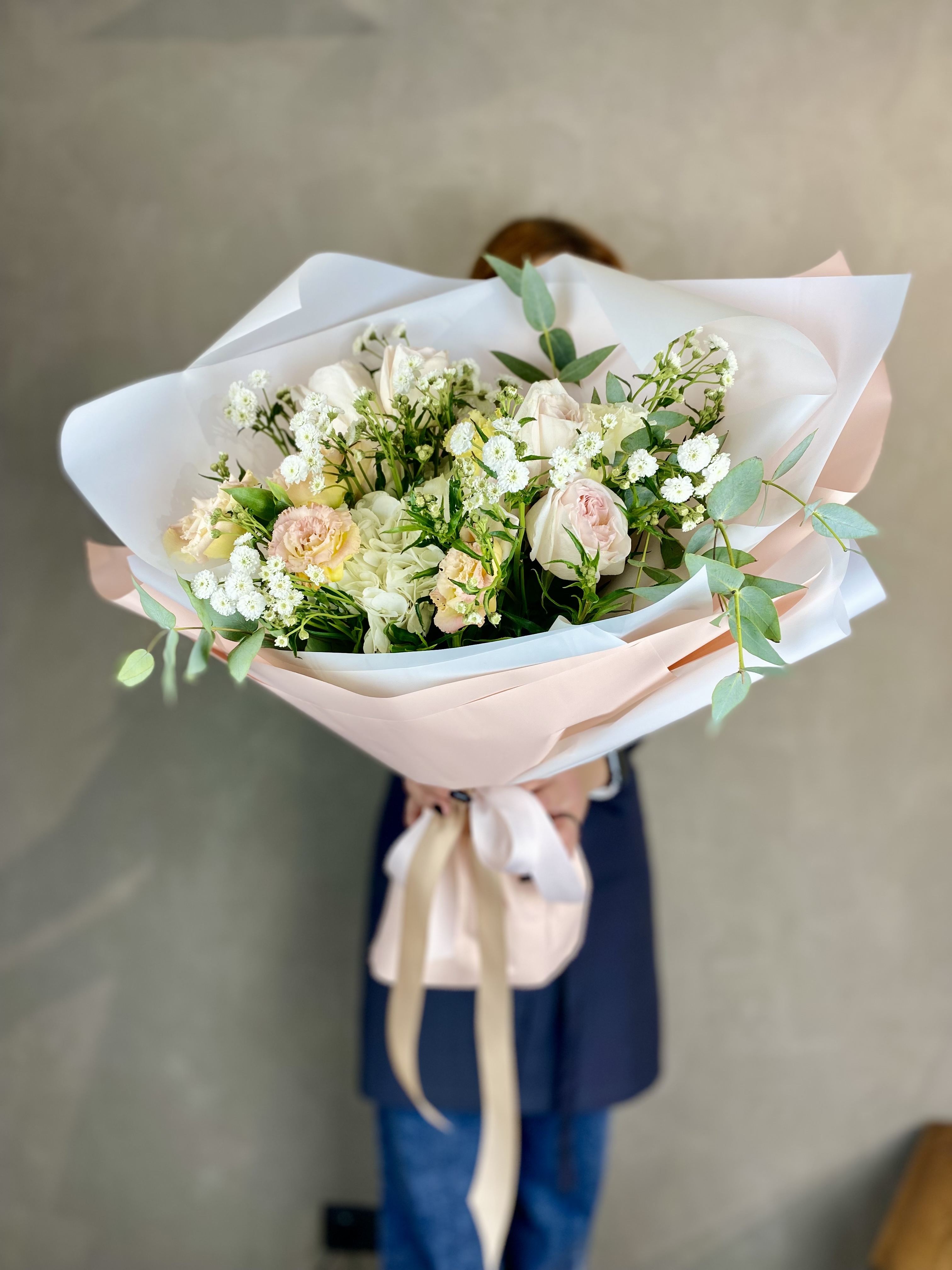 Плотная сборка с пышной гортензией в центре и рассыпчатыми соцветиями диантуса по краям. Эустома добавляет воздушности, а ветки озатамуса создают лёгкую графику. Букет держит форму и выглядит объёмно с любого ракурса.