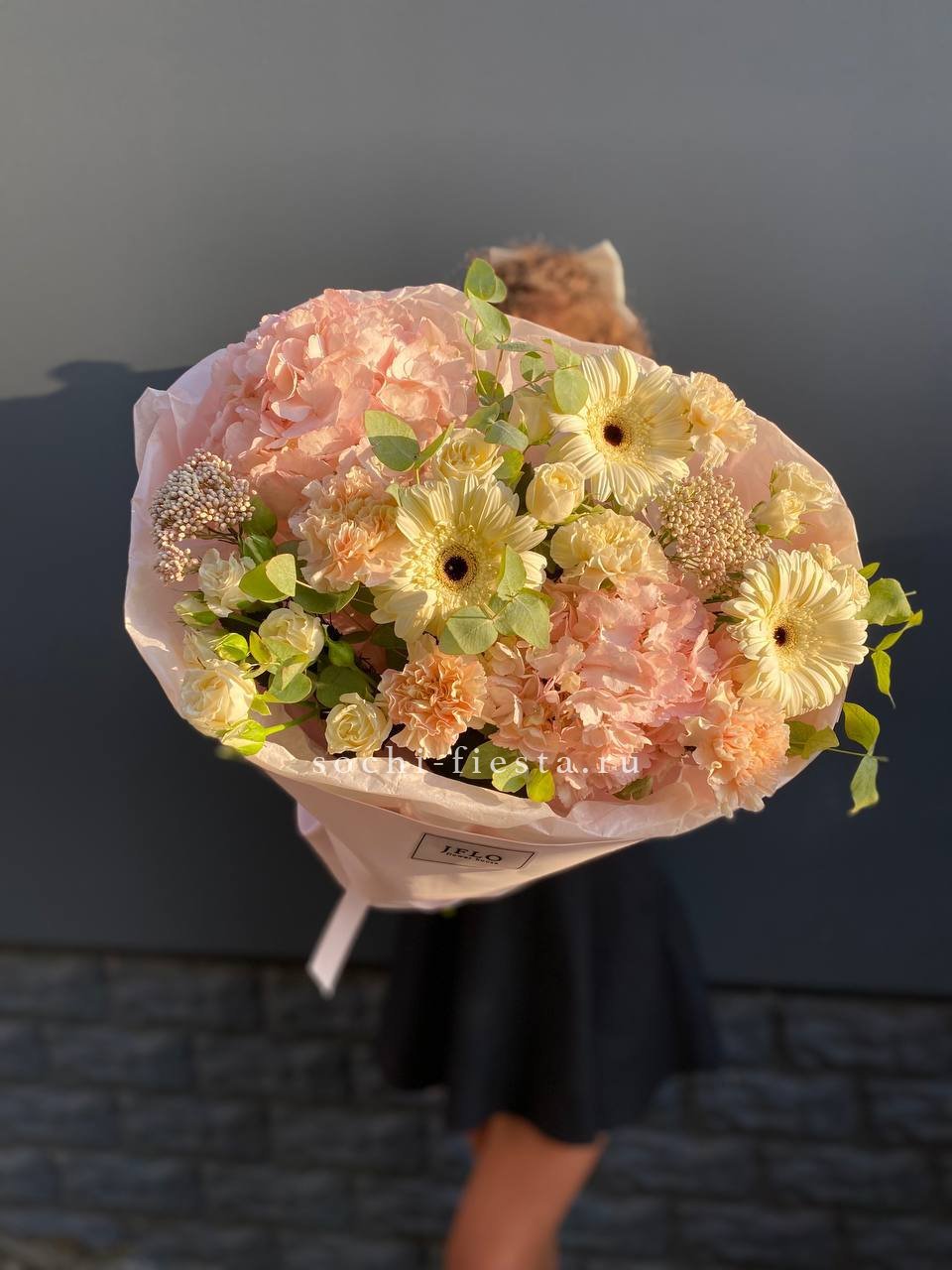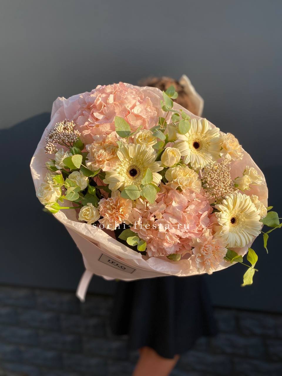гербера, диантус, гортензия, бомбамстик, озатамус в нежном оформлении.