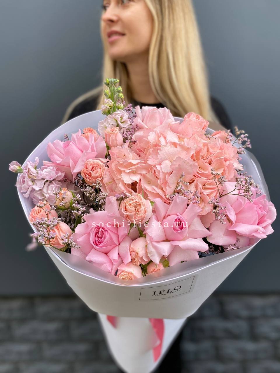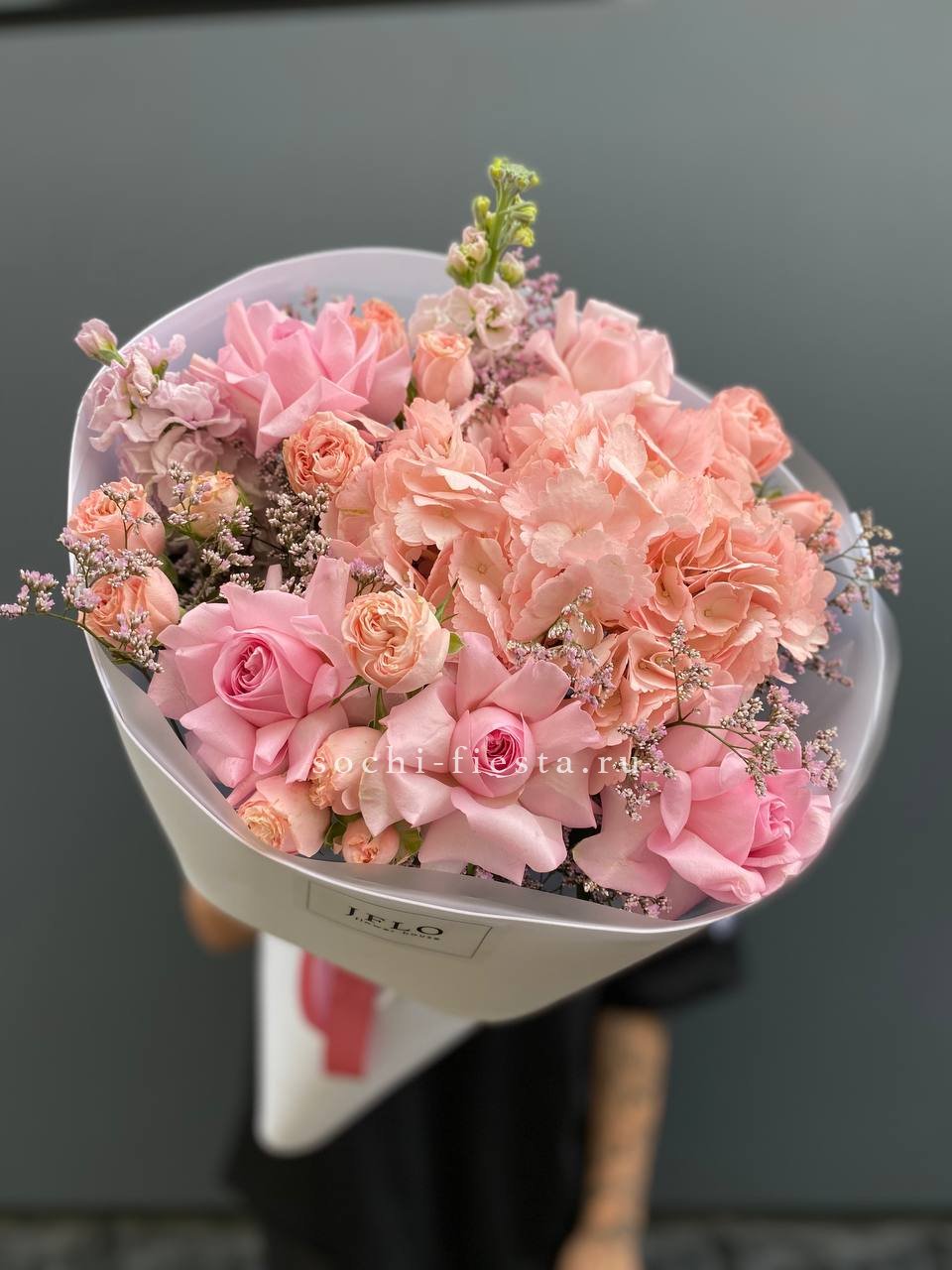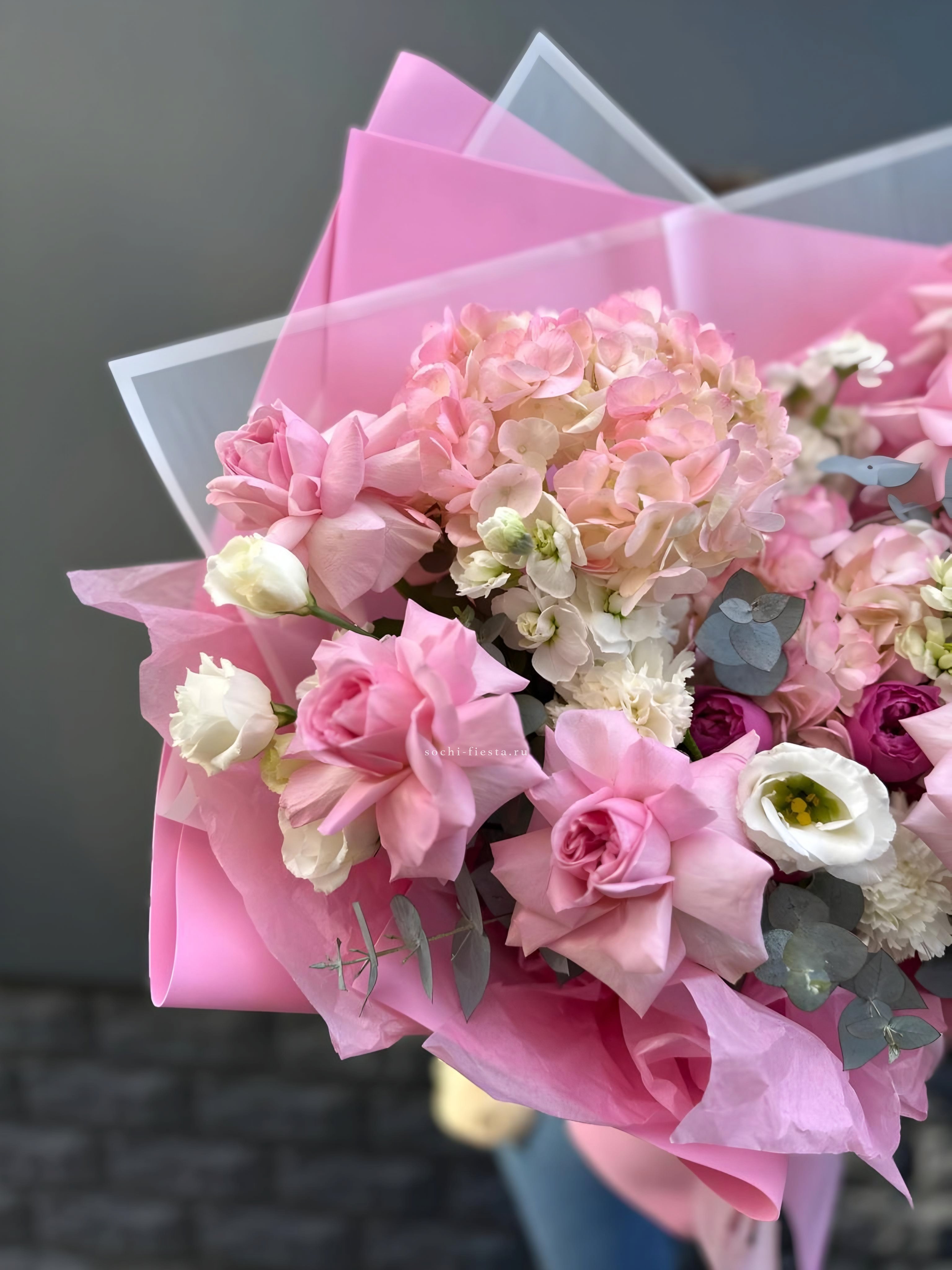 Диантусы и маттиола добавляют букету душистую лёгкость, а гортензия создаёт объёмную основу. Мисти баблс и эвкалипт рисуют воздушный контур вокруг розовых оттенков.