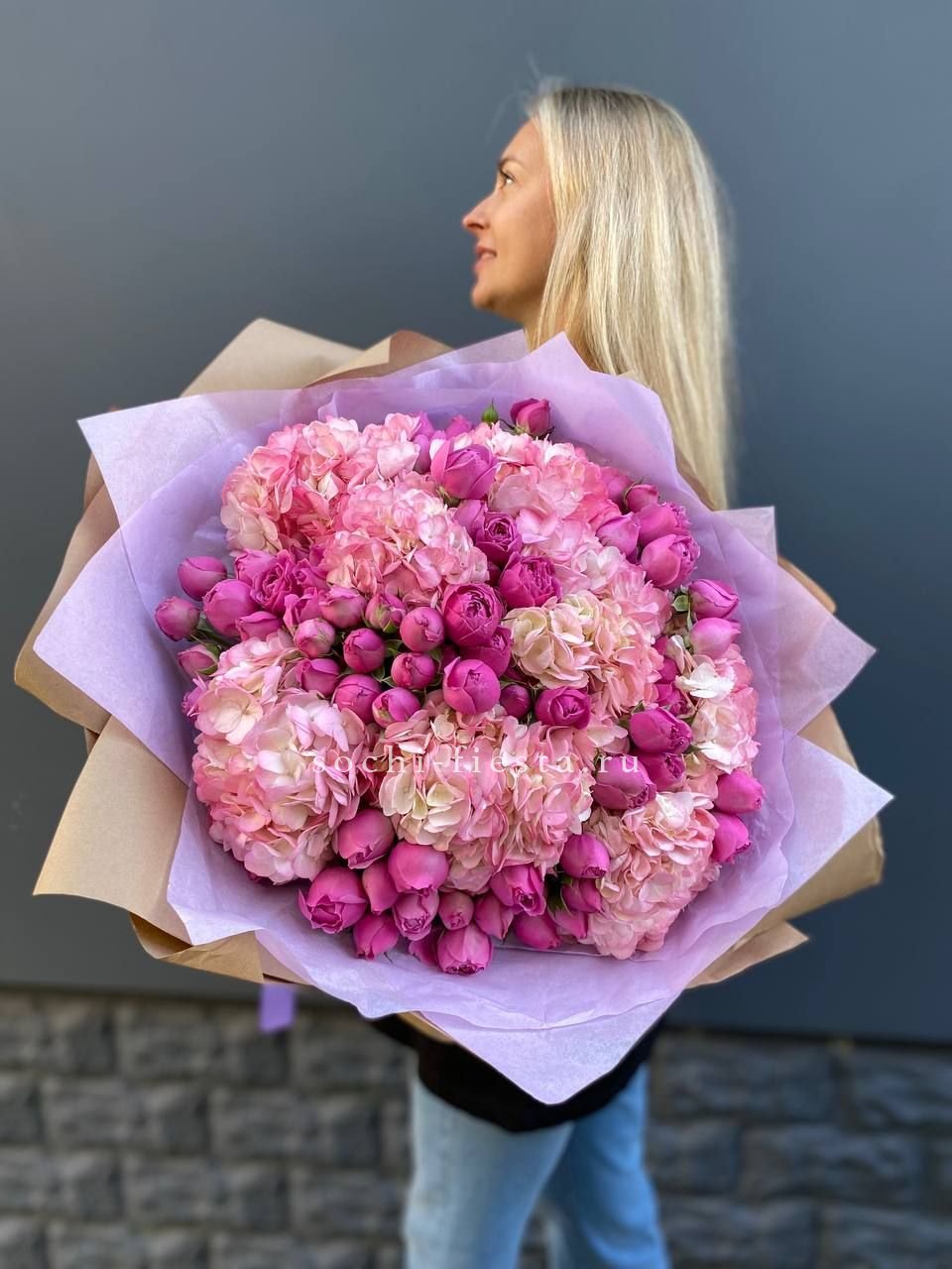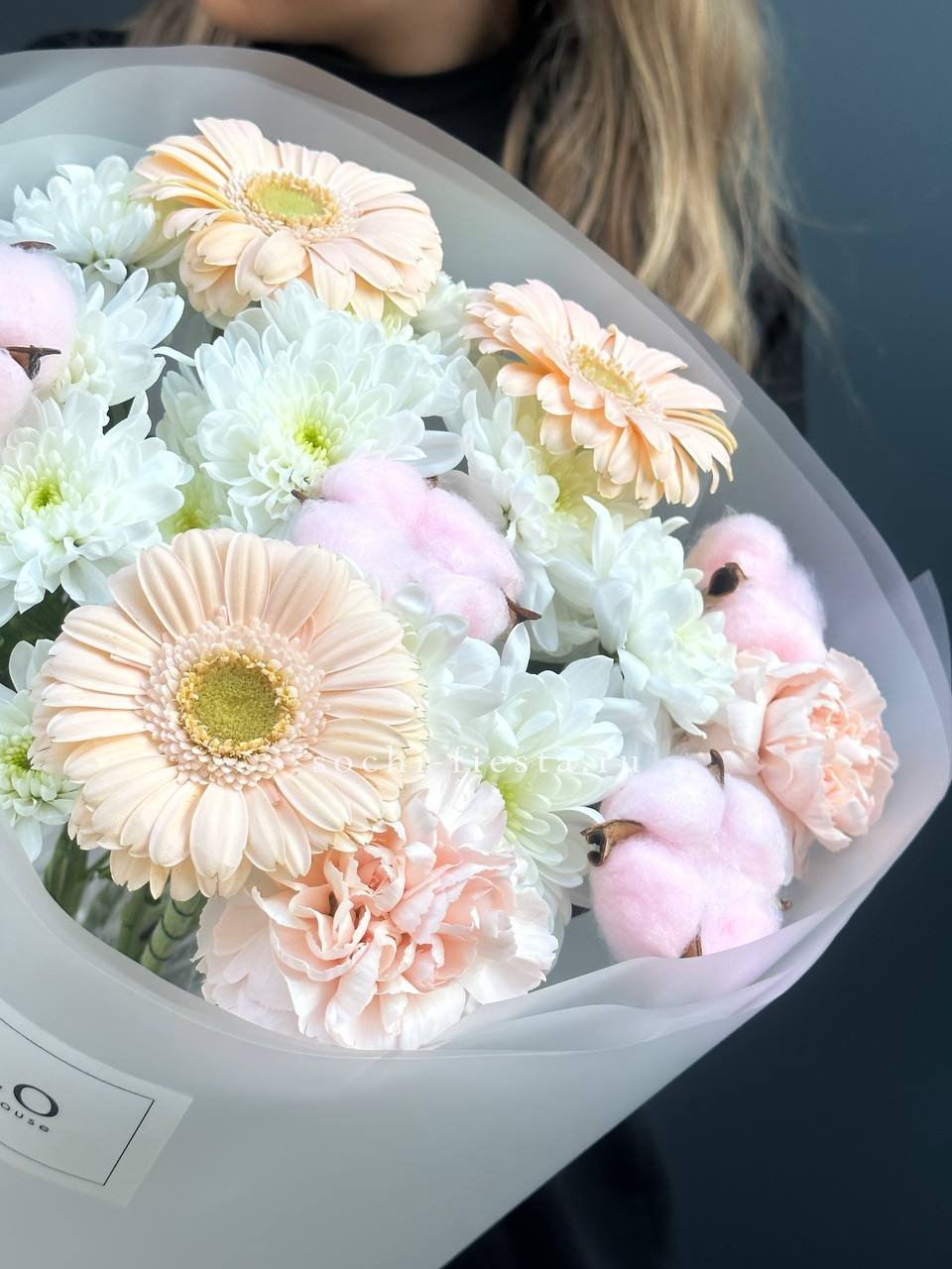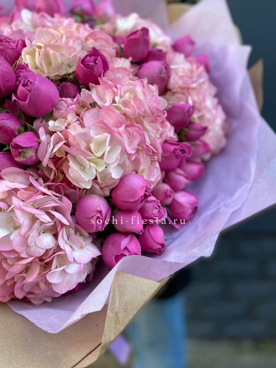 Диантусы и маттиола добавляют букету душистую лёгкость, а гортензия создаёт объёмную основу. Мисти баблс и эвкалипт рисуют воздушный контур вокруг розовых оттенков.