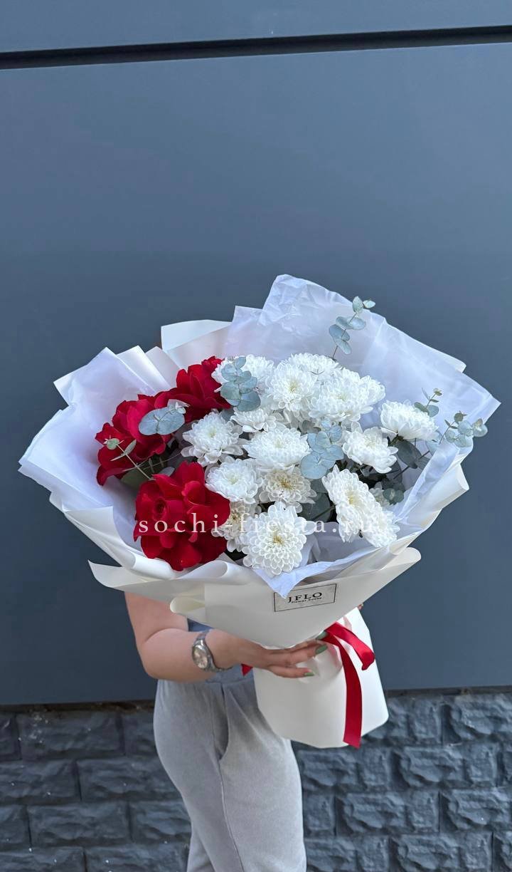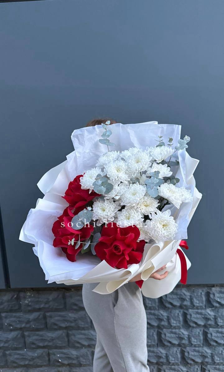 Красные розы и кустовая хризантема складываются в плотный ритмичный букет. Эвкалипт смягчает линии, а воздушная упаковка подчёркивает естественность формы.