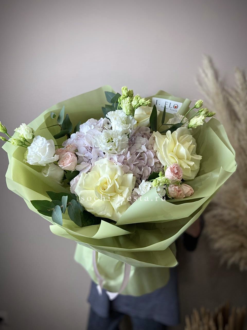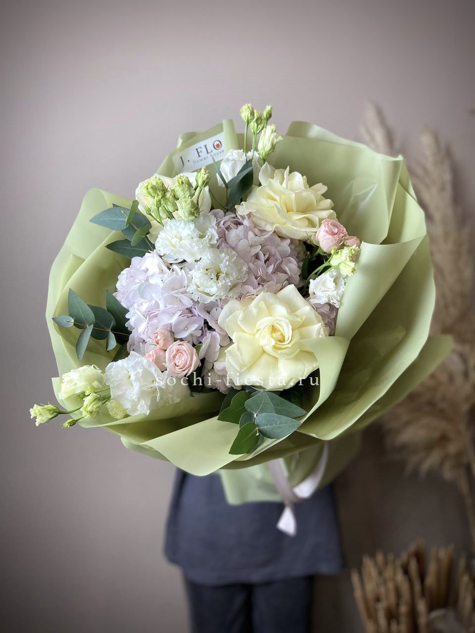 гортензия, гербера, диантус, эустома, свит ревиваль, кустовая роза, эвкалипт, лента, корейская пленка.