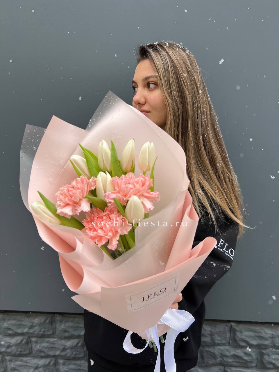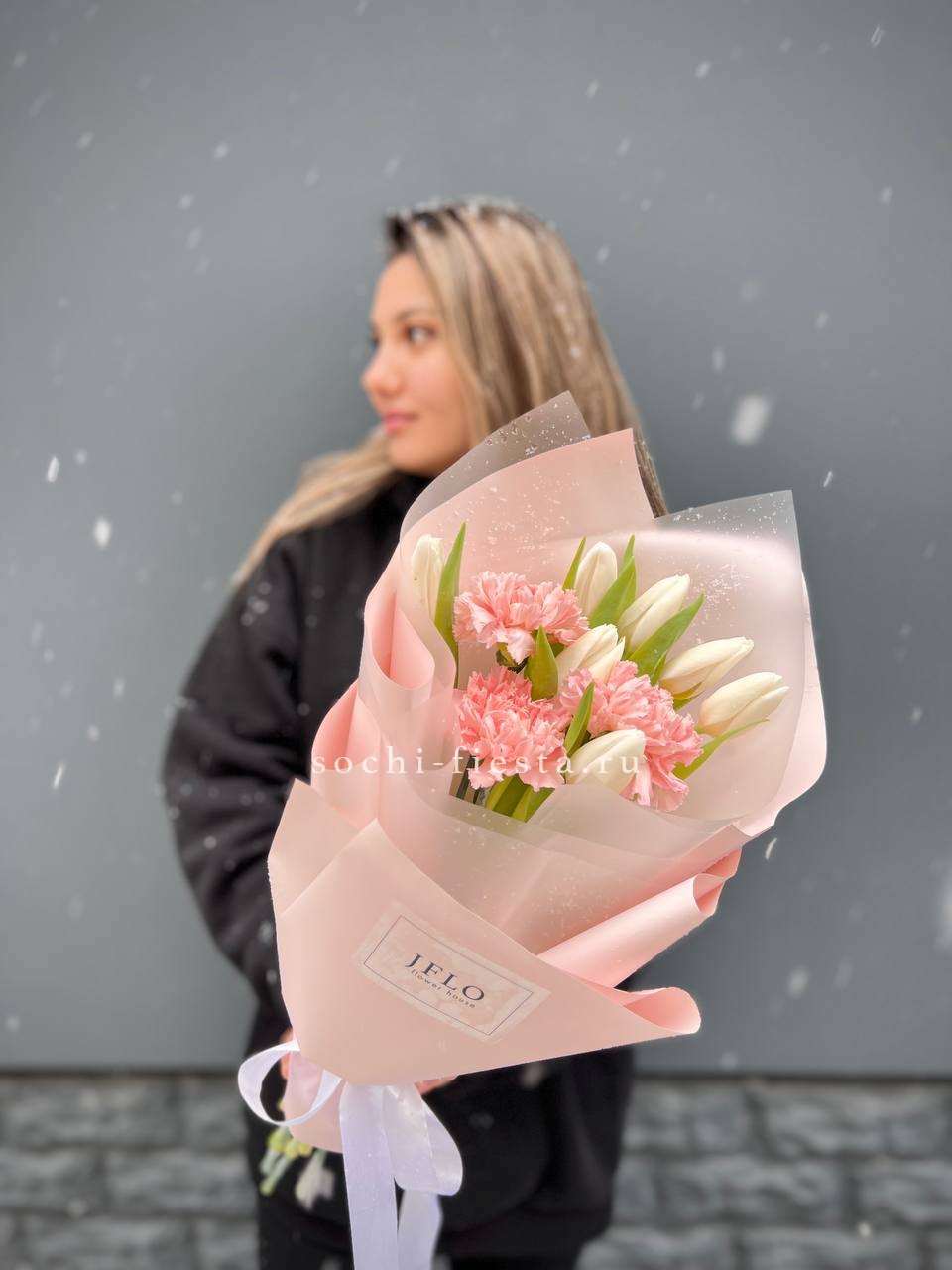Тюльпаны и диантусы собраны в лёгкую композицию с открытой структурой. Букет дышит и держит форму благодаря продуманному ритму расположения бутонов.