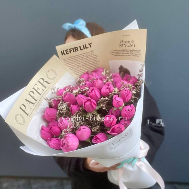 Сезонные позиции требуют предзаказа. Пионы в мае-июне — за 10-14 дней (местная логистика требует запаса). Тюльпаны к 8 марта — за 7-10 дней. Амариллис зимой — за 3-5 дней. Подсолнухи летом — за 3 дня.